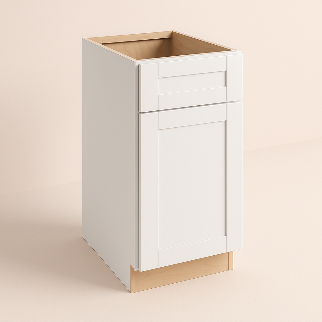 The Vesper White Shaker Base Cabinet combines durable plywood construction with a sleek shaker design, featuring soft-close doors and adjustable shelves for customizable storage. Its vinyl-clad finish ensures easy maintenance and a pristine look.