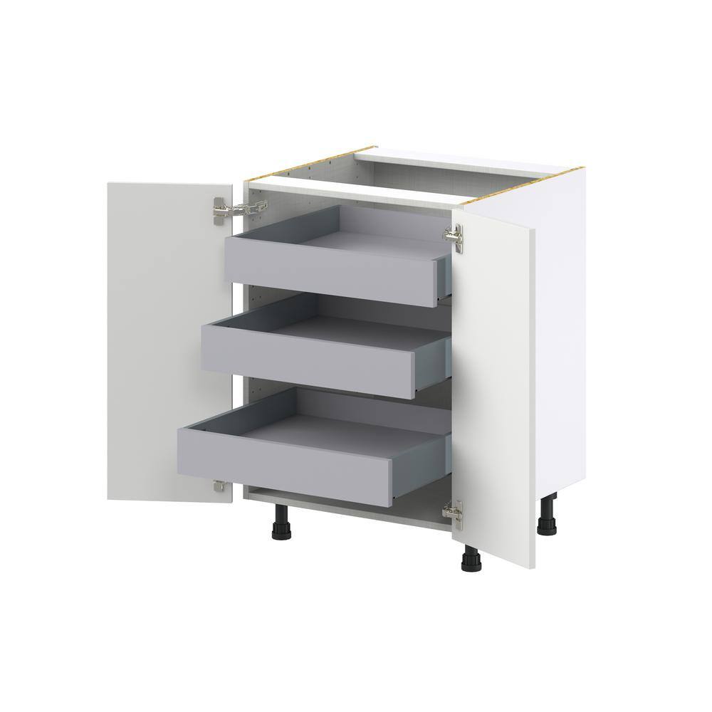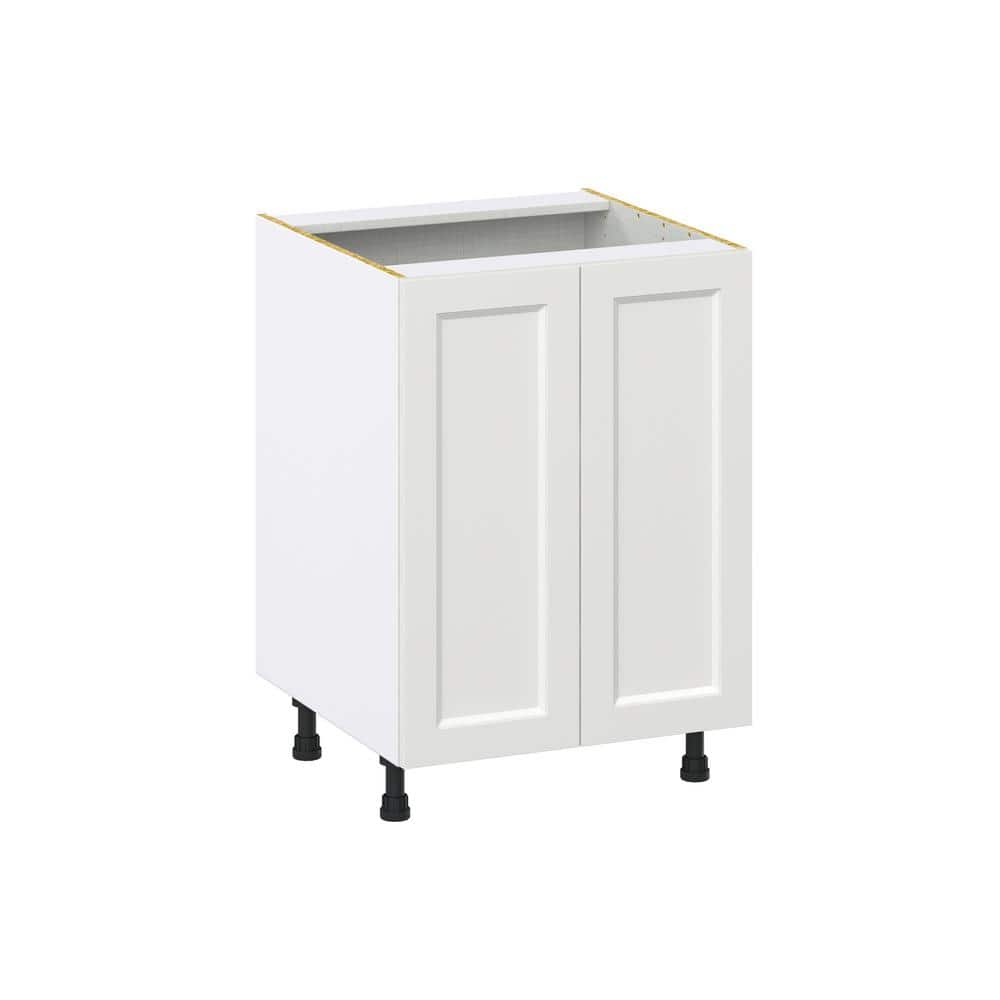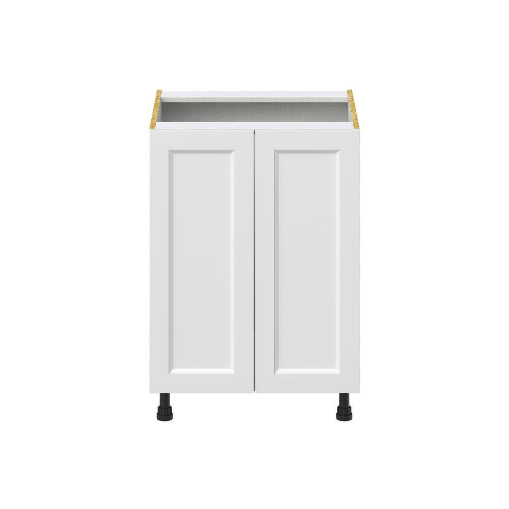Enhance your kitchen with the Alton Painted White Shaker Base Cabinet from J COLLECTION. This 24-inch wide cabinet offers a sleek and modern frameless design and includes three spacious inner drawers for organized storage. Its durable, chip-resistant finish and pre-attached adjustable legs make it a reliable and easy-to-install solution for any kitchen renovation.