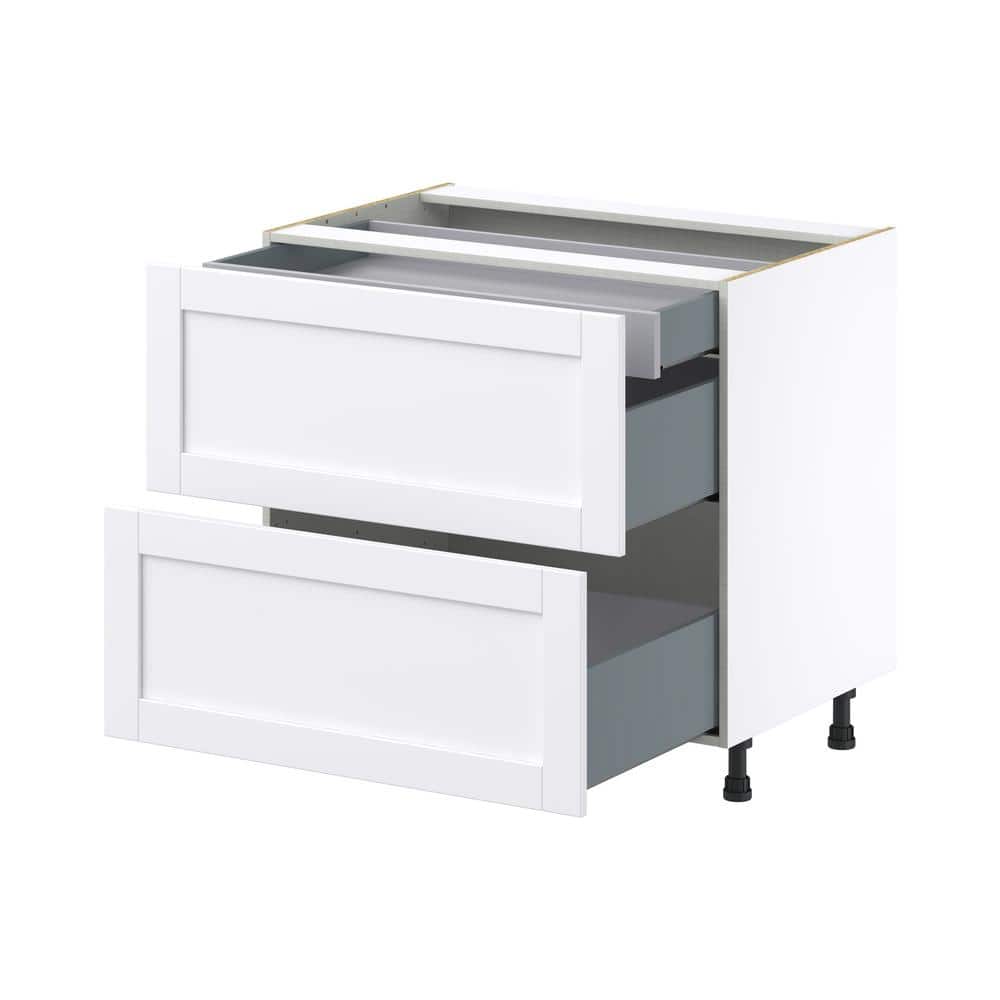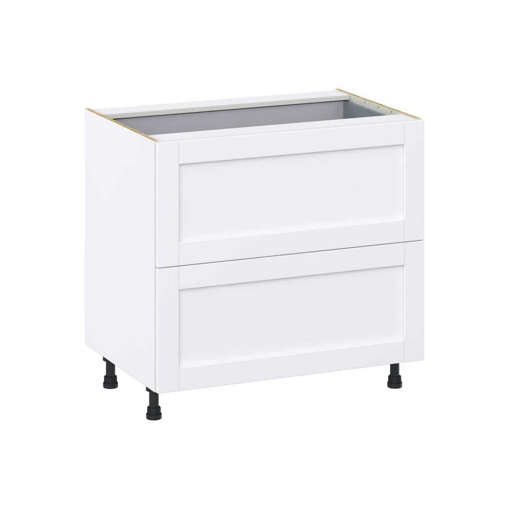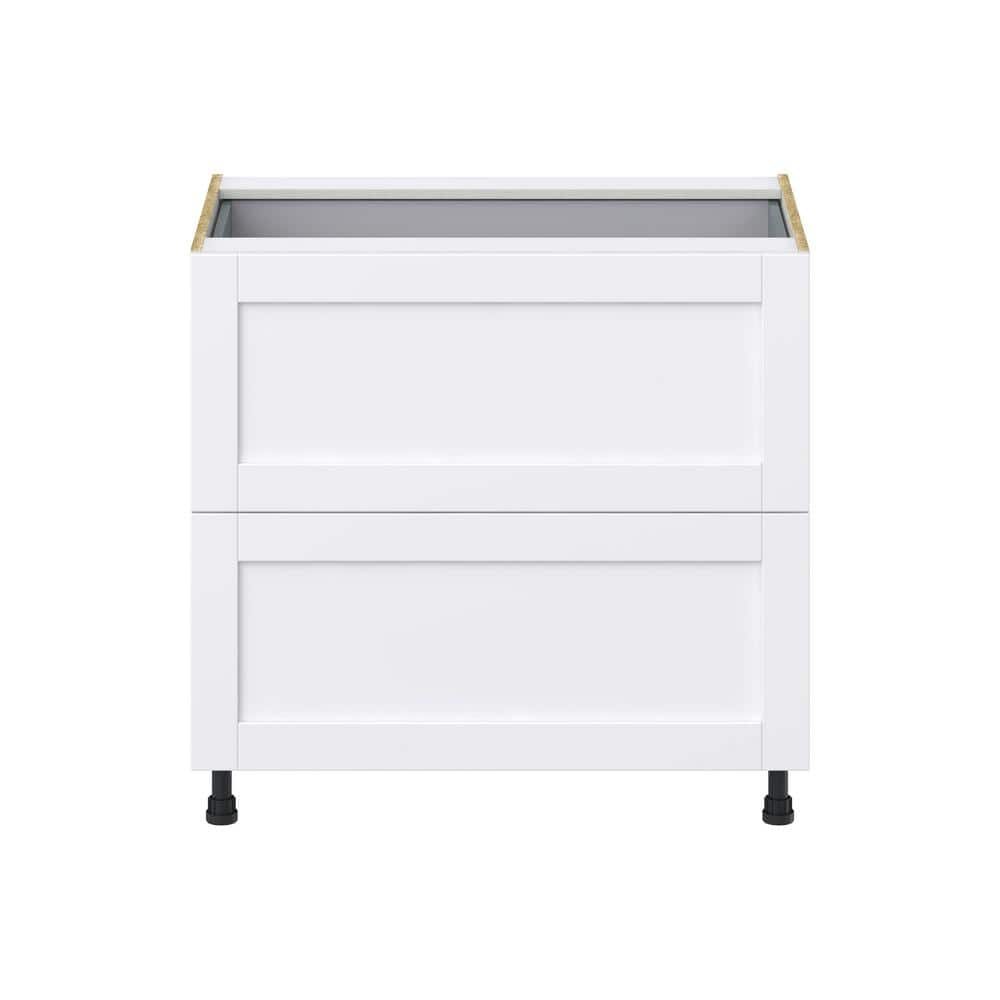 Elevate your kitchen design with the Mancos Bright White Shaker Kitchen Base Cabinet from J COLLECTION. This cabinet combines European style frameless construction with contemporary shaker doors for a sleek appearance, allowing for full access to stored items. Featuring soft-close drawers and a chip-resistant finish, it promises durability and ease of use for all your kitchen storage needs.