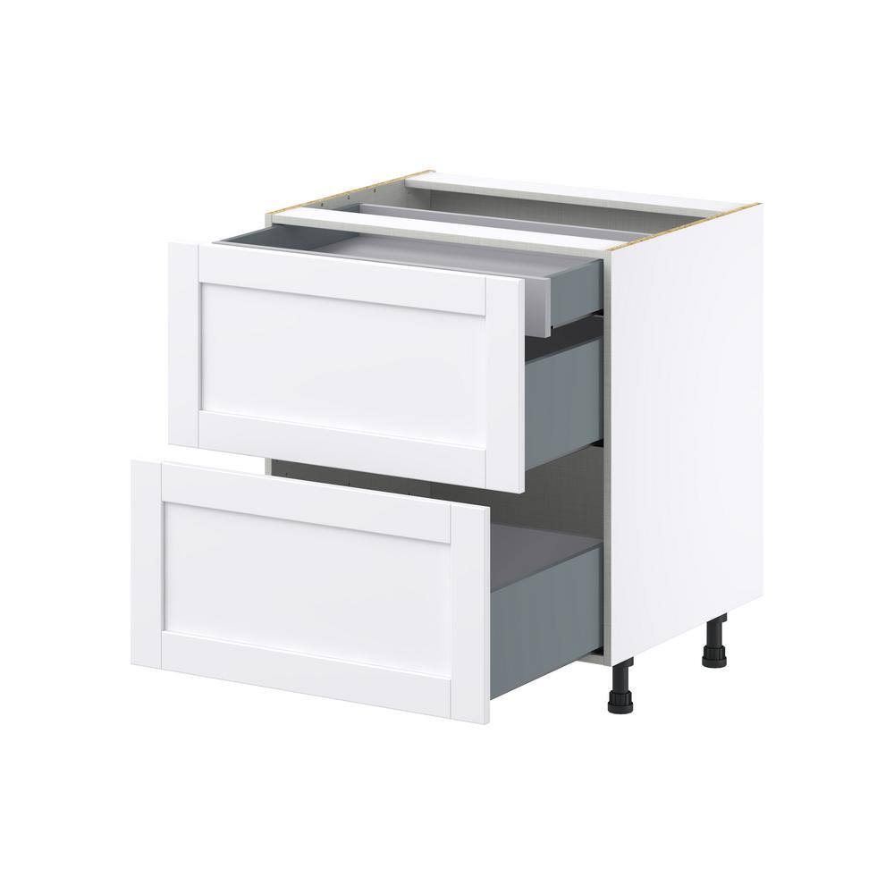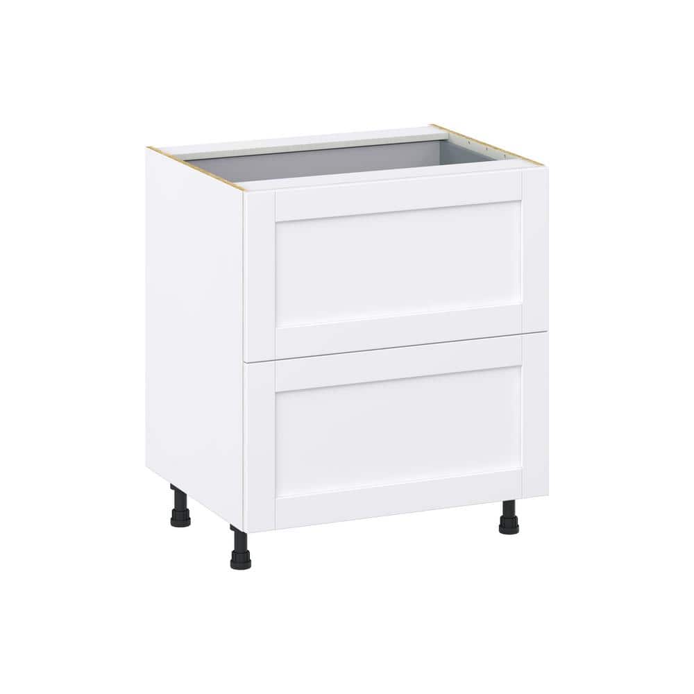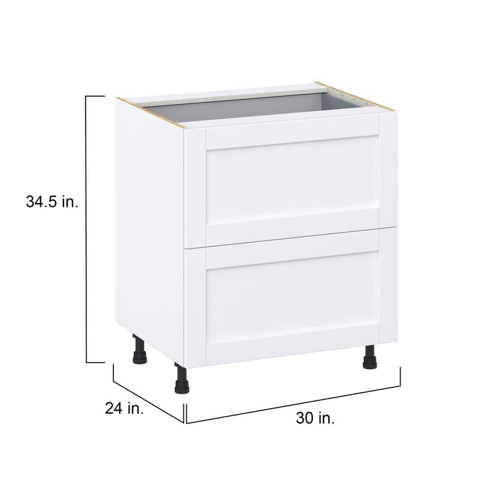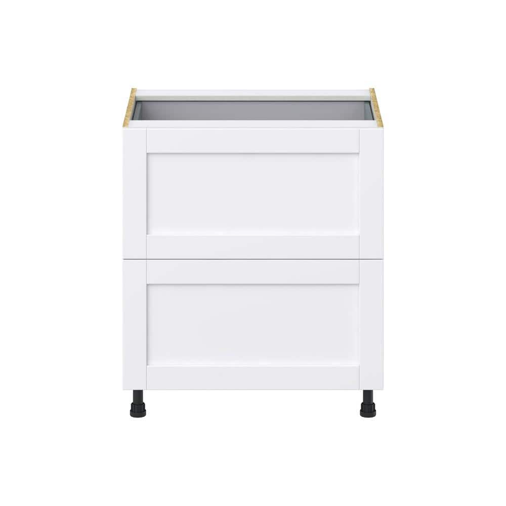 Transform your kitchen with the J COLLECTION Mancos Bright White Shaker Base Kitchen Cabinet, featuring a frameless design for a sleek, modern look. Enjoy enhanced functionality with spacious, soft-close drawers and a durable, chip-resistant finish. Installation is a breeze with its pre-installed adjustable legs.
