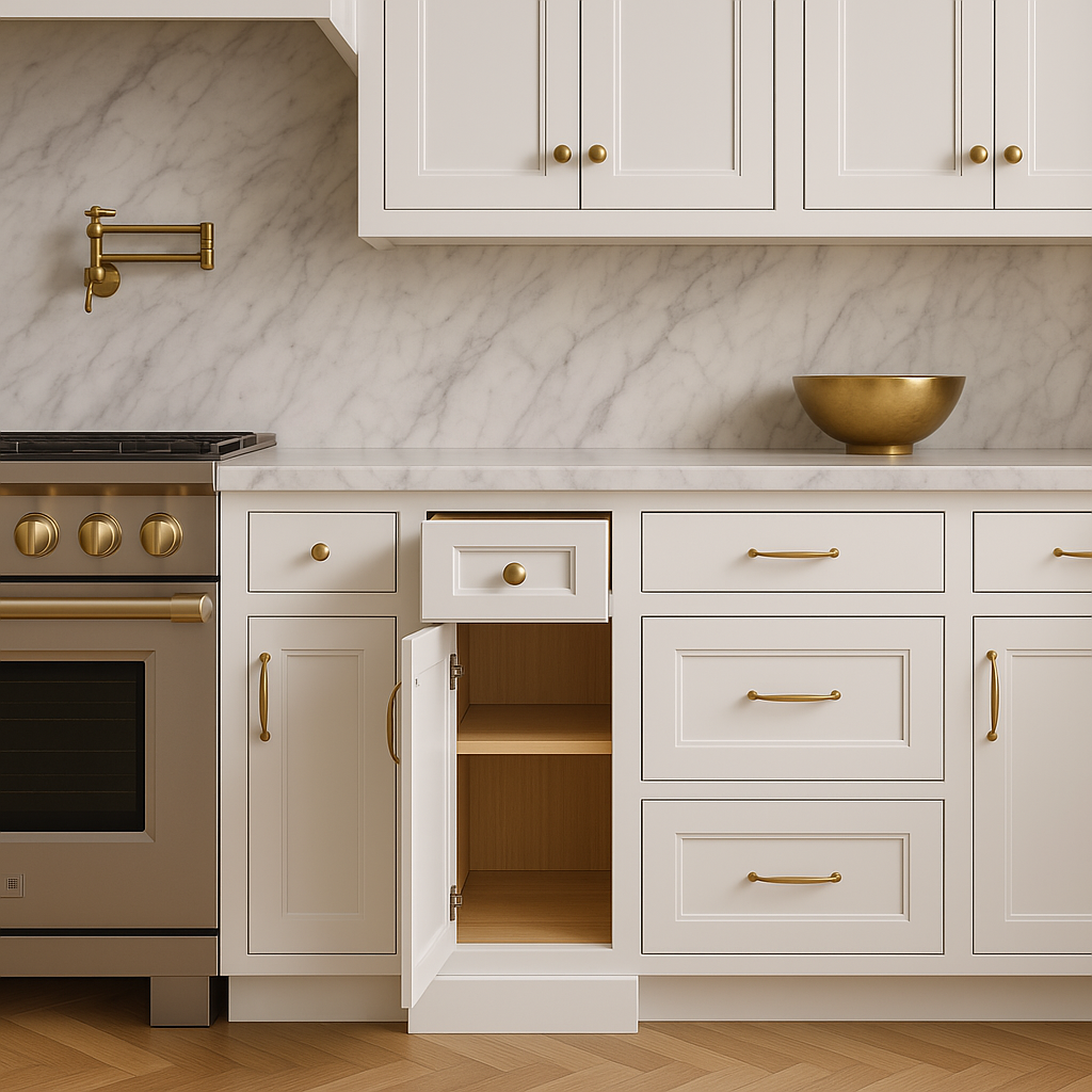 Kitchen Cabinet Features Adjustable Shelves, Finished Interior, Full Extension Drawers, Soft Close Doors, Soft Close Drawers