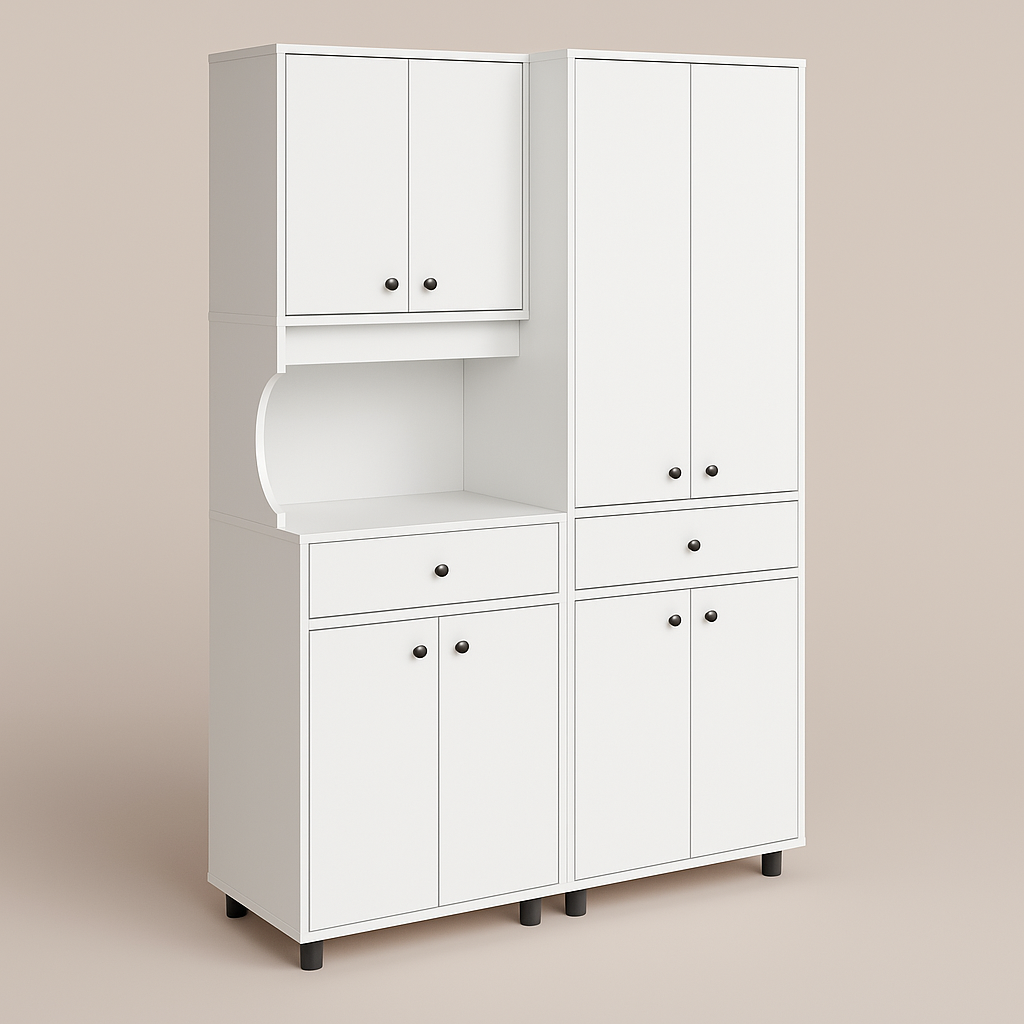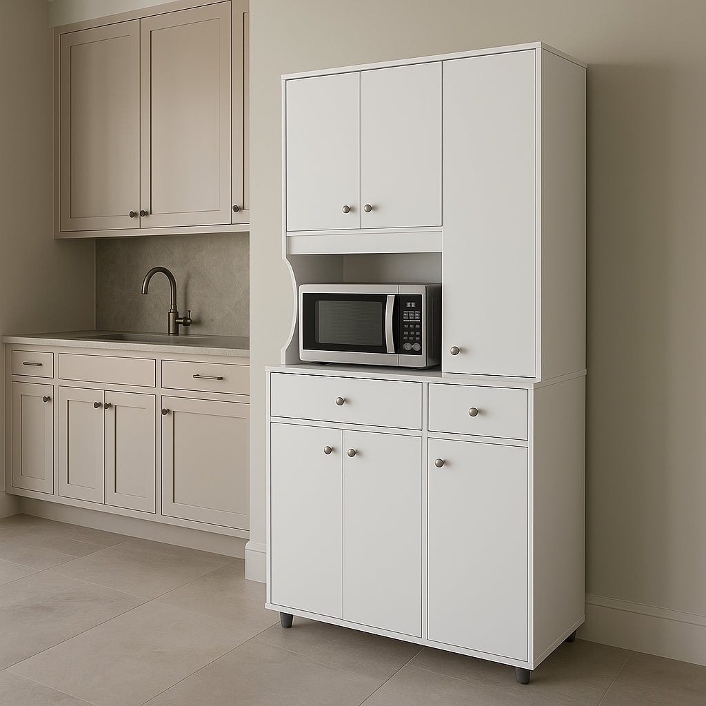 Transform your kitchen with this elegant utility cabinet, blending modern design with practical functionality. The sleek white laminate finish and brushed metal knobs add a touch of sophistication, while the adjustable shelves and spacious drawers provide versatile storage solutions. Style it with a chic microwave or coffee maker to create a functional yet stylish focal point. This cabinet is a must-have for a refined and organized kitchen space.