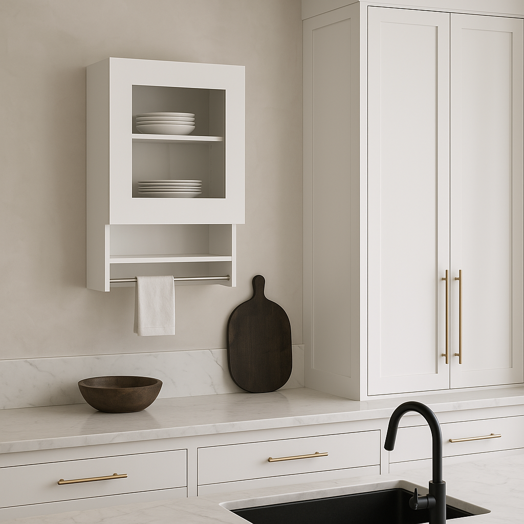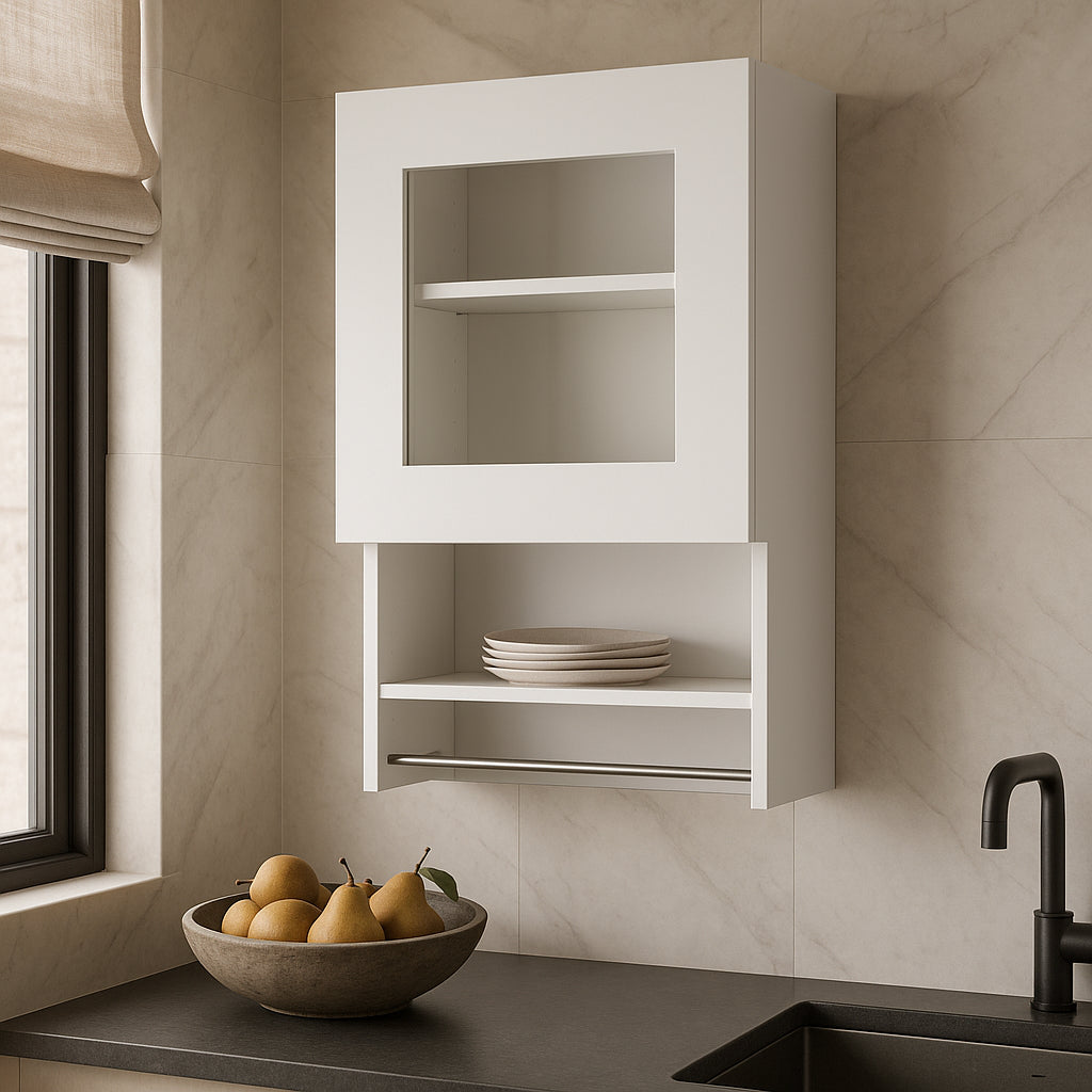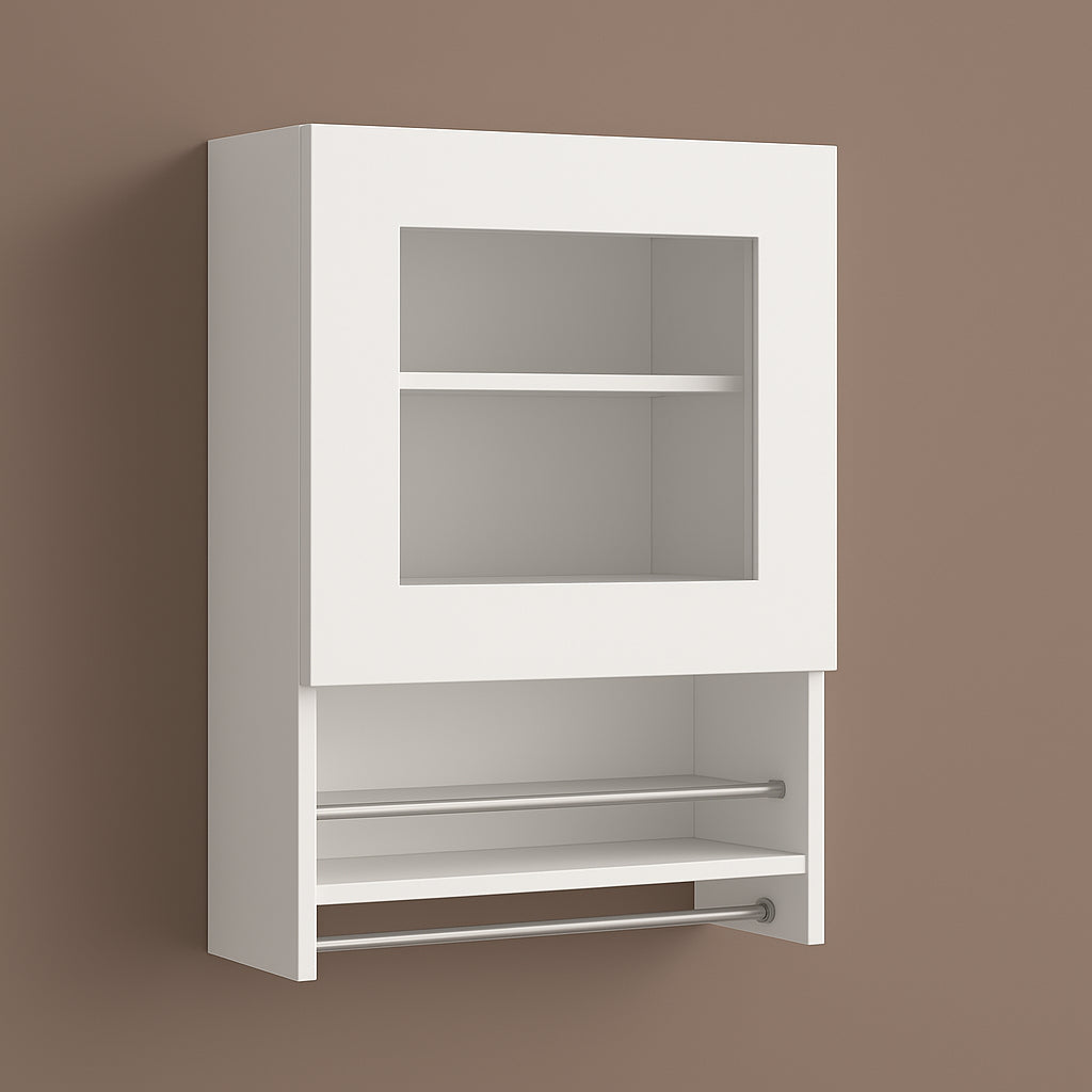 The Sarlai Wall Mounted Kitchen Cabinet combines modern design with practical functionality. Featuring a sleek single-door glass cabinet, interior shelves, a towel rack, and a spice rack, it is perfect for organizing and enhancing your kitchen or bathroom space.