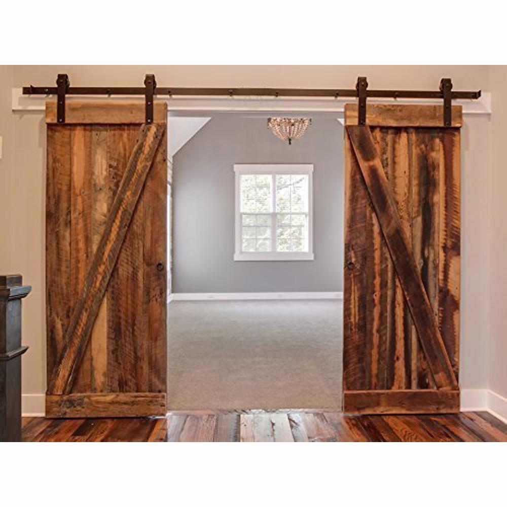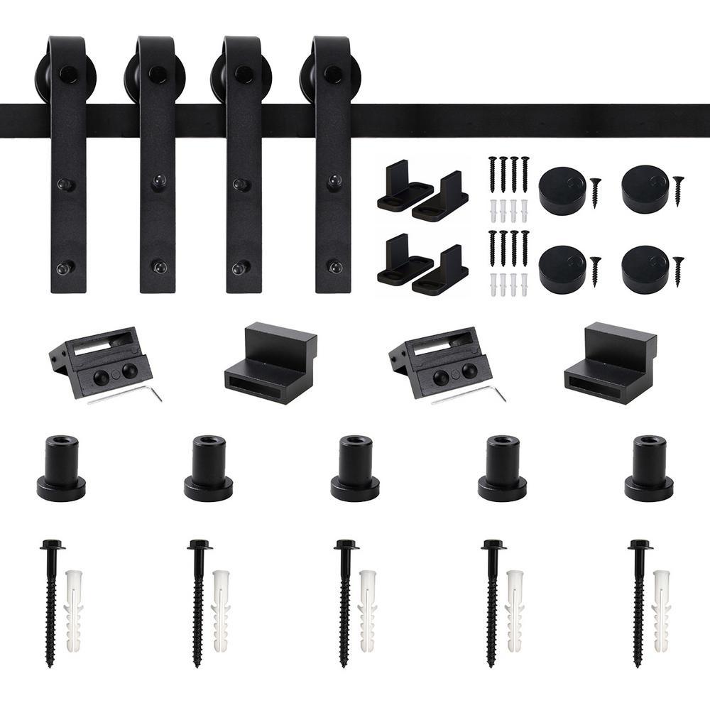 Keep your barn doors rolling easily and quietly with this WINSOON 72 in. Frosted Black Sliding Barn Door Hardware Track Kit . Balanced hangers keep the weight even on the wheels for smooth operation. A precision, solid carbon steel extruded track adds durability and guarantees that the doors will not jump track. Includes door stoppers to set the exact sliding range. The strong floor guide stabilizes door movement. Kit is for double doors 1-3/8 in. and 1-3/4 in. thick, up to 230 lbs. Doors are not included.