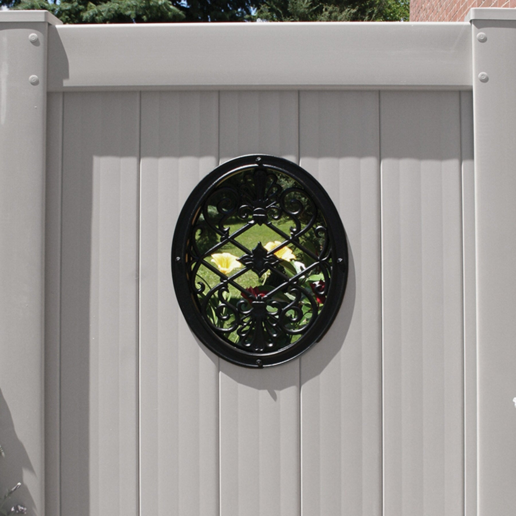 Enhance your wood fence with the Nuvo Iron Decorative Gate Insert, crafted from durable cast aluminum with a black powder-coated satin finish. Featuring a captivating oval-framed floral and paisley pattern, it offers a touch of elegance and strength to any outdoor space.