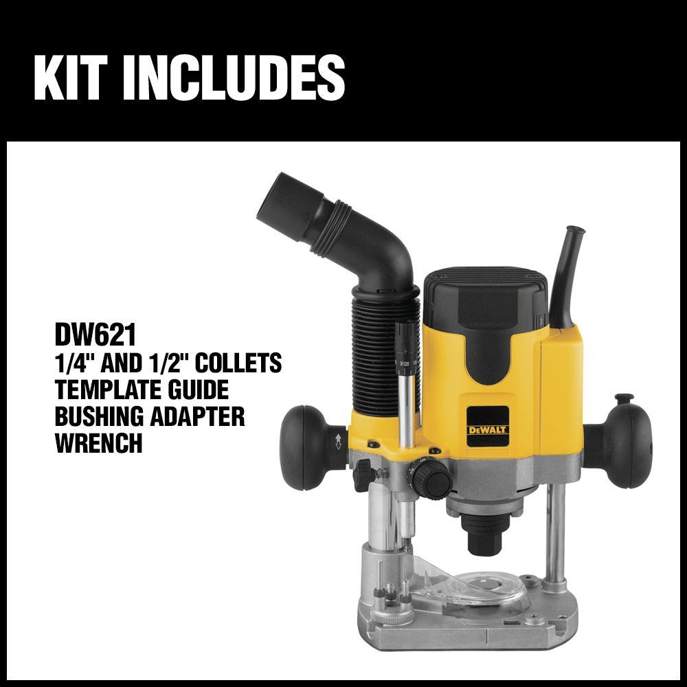 The DEWALT DW621 router features a full wave electronic variable speed motor with soft start. This router's 8,000-24,000 rpm motor is designed for constant speed under load to ensure a quality finish in all materials. A rack and pinion depth adjuster, with micro-fine adjusting allows quick, accurate set-up of this router. Phosphorous bronze bushings provide a smooth and accurate plunge every time. Also includes 1/4 in. collet, 1/2 in. collet, template guide bushing adapter, and wrench.