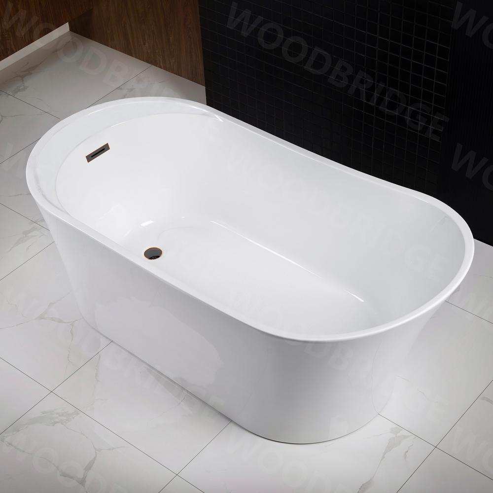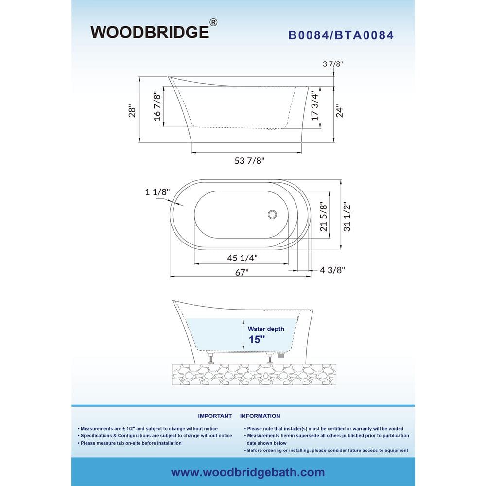 Luxuriate in the WOODBRIDGE Wayne 67-inch single-slipper tub, crafted from high‑gloss Lucite acrylic reinforced with fiberglass for lasting durability. Its double‑walled design helps retain water temperature, while the sealed overflow and matching oil‑rubbed bronze drain deliver a clean, leak‑resistant install.