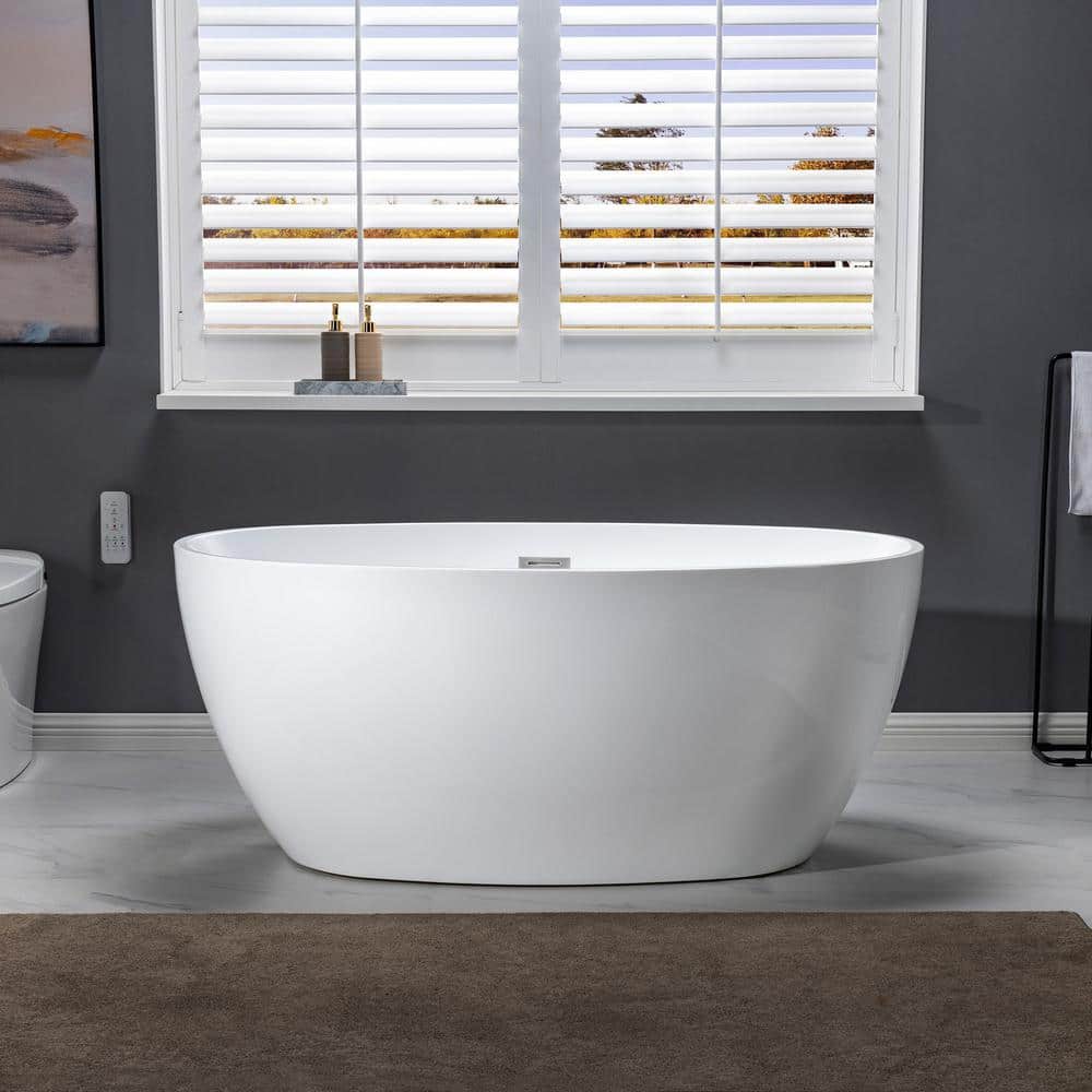 Compact yet luxurious, the WOODBRIDGE Tarbes 55-inch freestanding soaking tub features high-gloss Lucite acrylic reinforced with fiberglass for lasting durability. A center drain with integrated polished-chrome overflow, textured non-slip floor, and double-walled insulation deliver comfort, safety, and easy maintenance in modern baths.