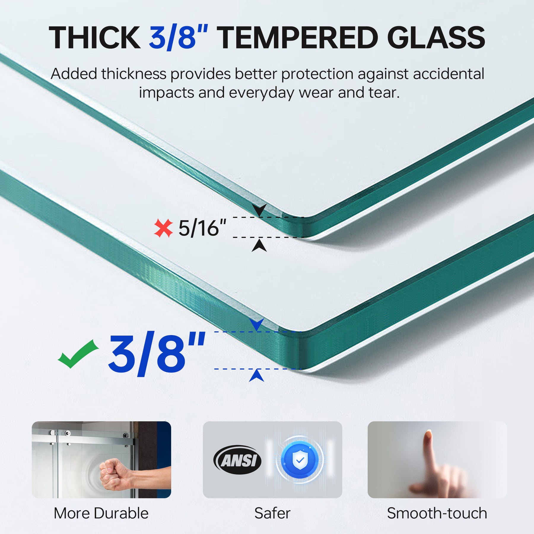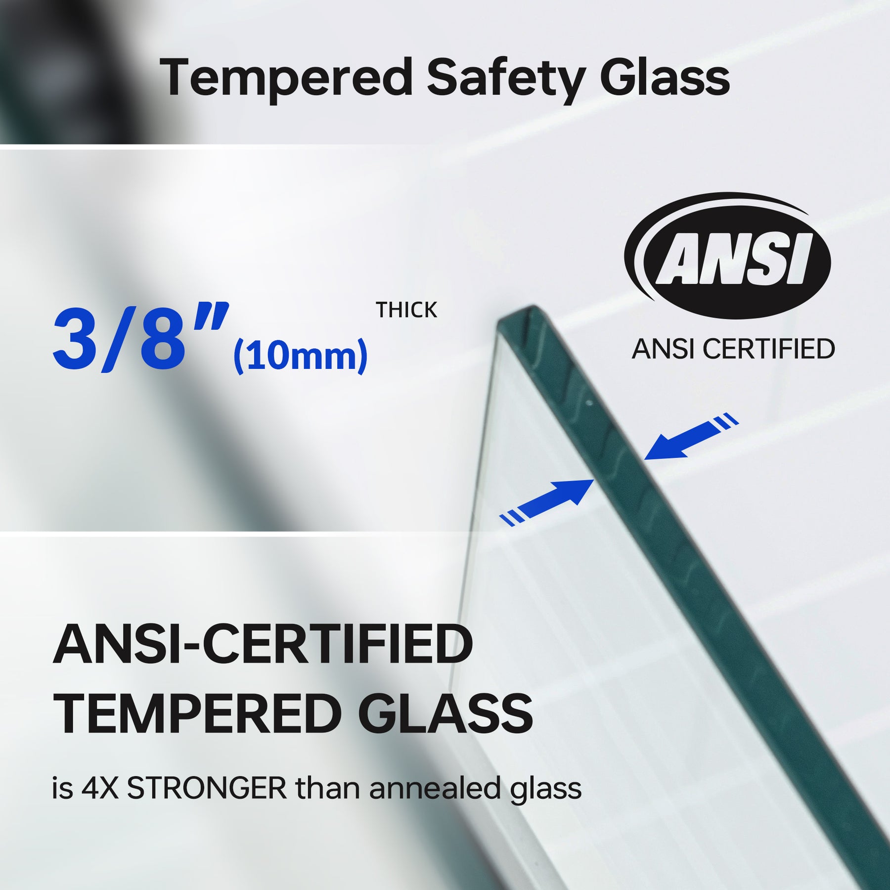 • Safety Glass: 3/8 in. (10 mm) ANSI-certified tempered glass with shatter retention film for added security.