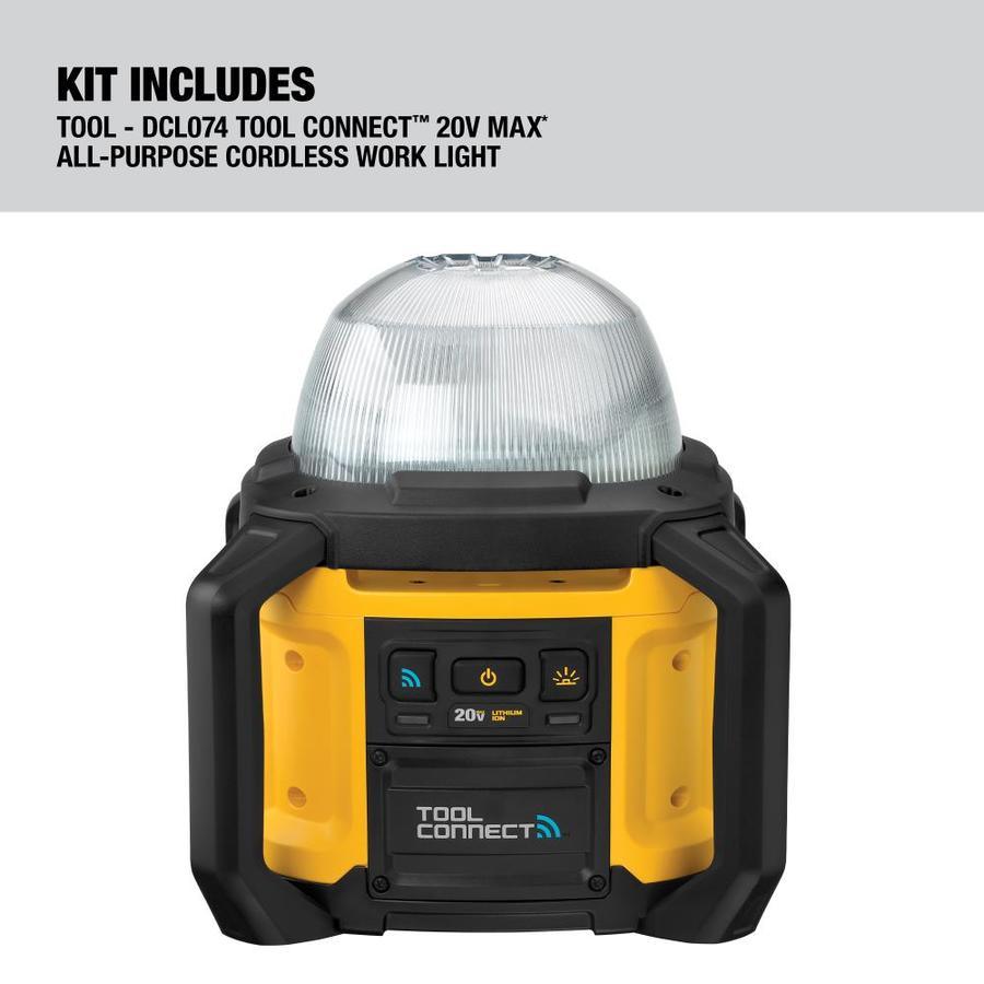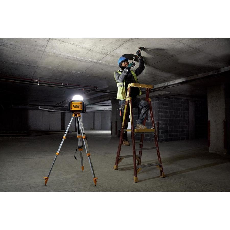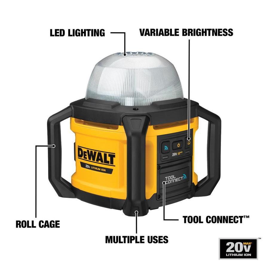 LED provides natural white light for jobsite illumination Durable impact-resistant design stands up to jobsite conditions Set up with freestanding, tripod-mounted (sold separately), or hanging via hook Remotely control, monitor, and track one or more units with tool connect Manufactured by DEWALT