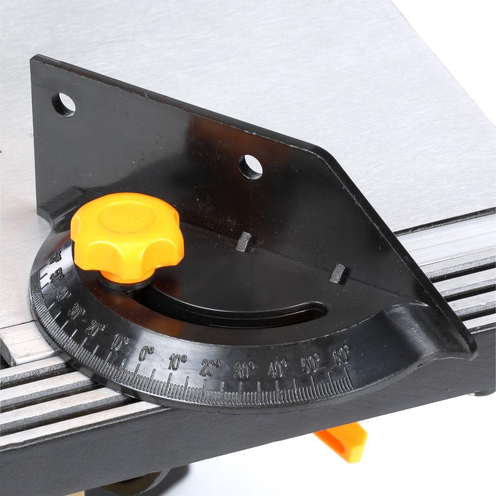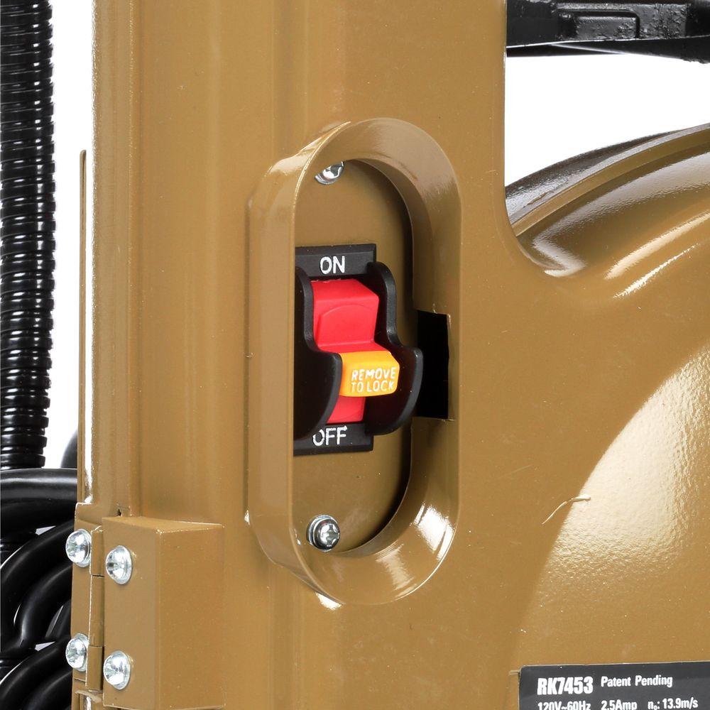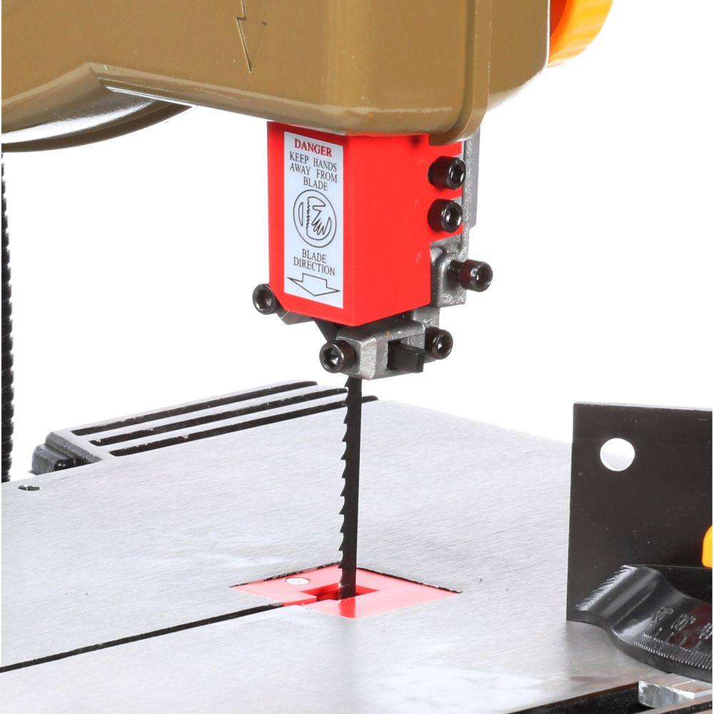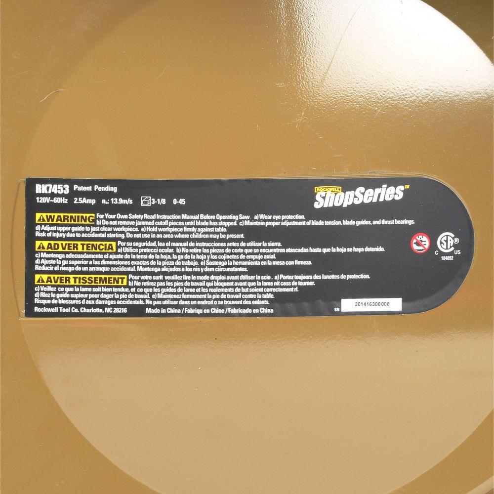 Lightweight and easy to transport the Rockwell 9 in. Band Saw with Work Light is a powerful bench-top band saw with a 2.5 Amp motor and a large 11-13/16 in. sq. ribbed aluminum table. With a table-tilting adjustment ranging from 0° to 45° for bevel cuts and a blade guide adjustment for custom depth settings, the saw is extremely versatile. It includes a work light for illuminating the cutting area.