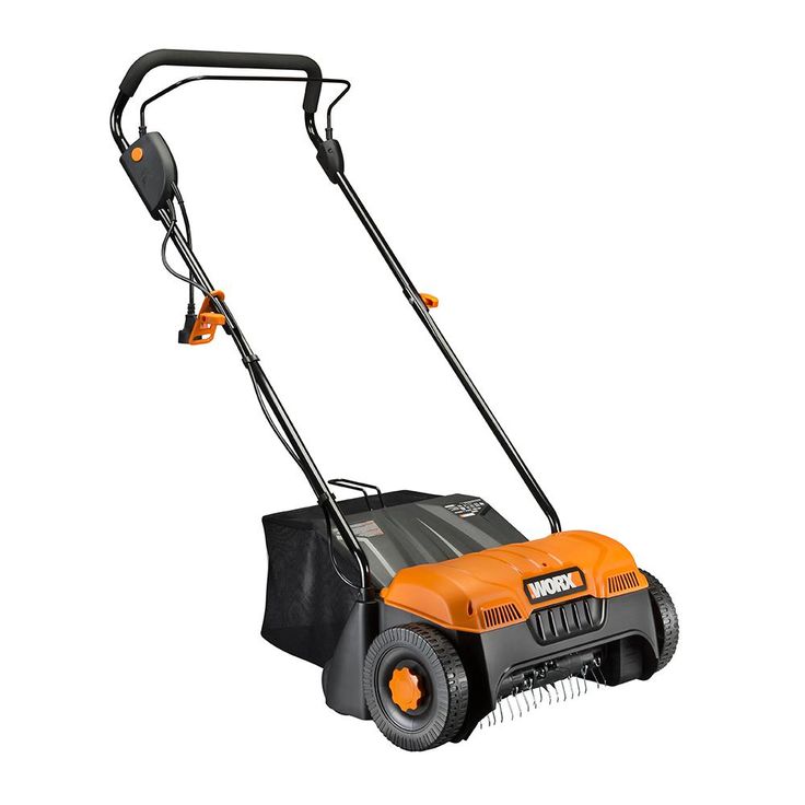 The 14” – 12A Electric Dethatcher from Worx was made for working over rough patches, or the whole yard. Dethatch dead grass and debris, even roots with 14” wide tines, at 3 different depths: -9mm, -3mm, +3mm. Your lawn will be healthier, greener, and easier to maintain in the future. The handle folds down for easy transport and storage. The lock-off switch keeps you safe. And the collection bag keeps you clean.