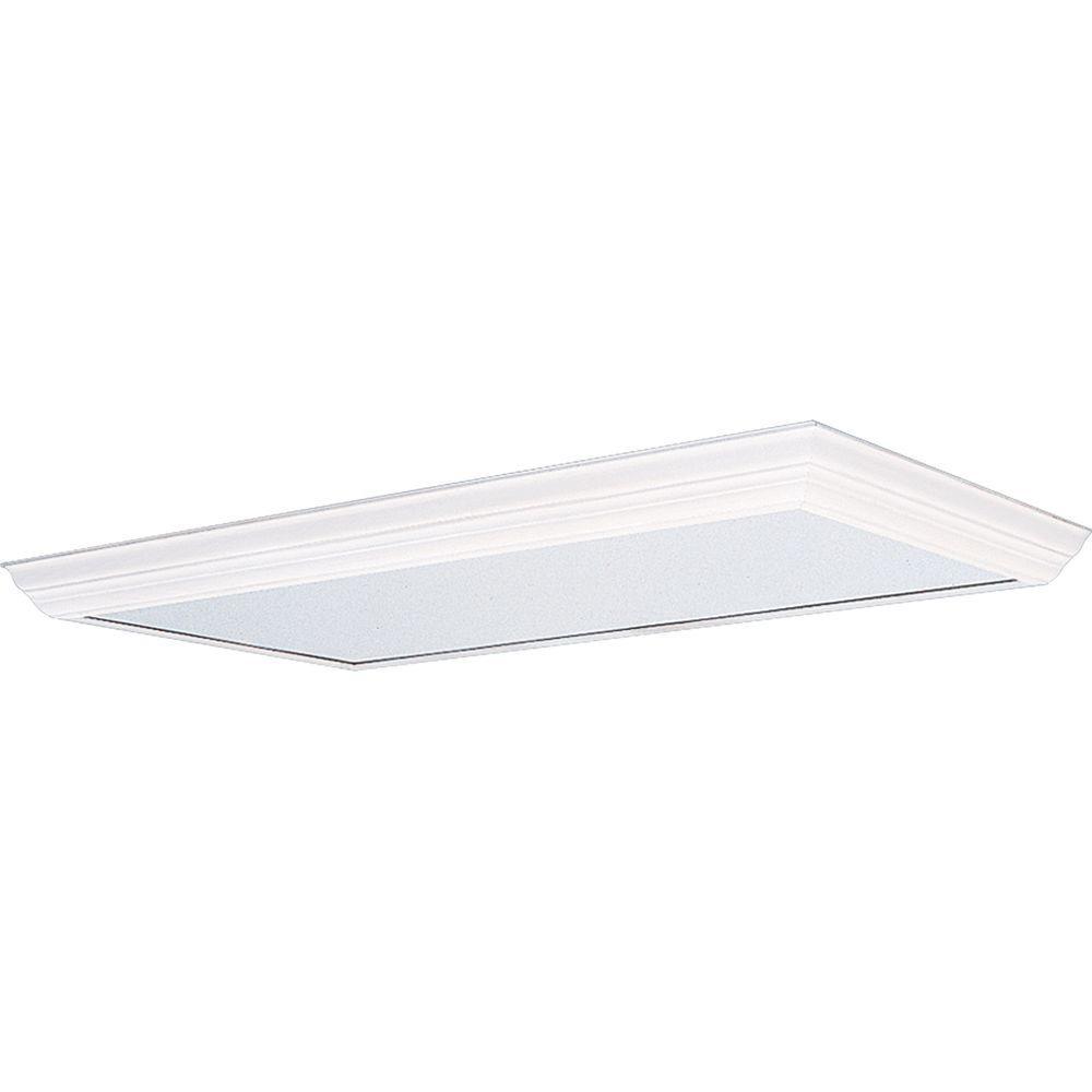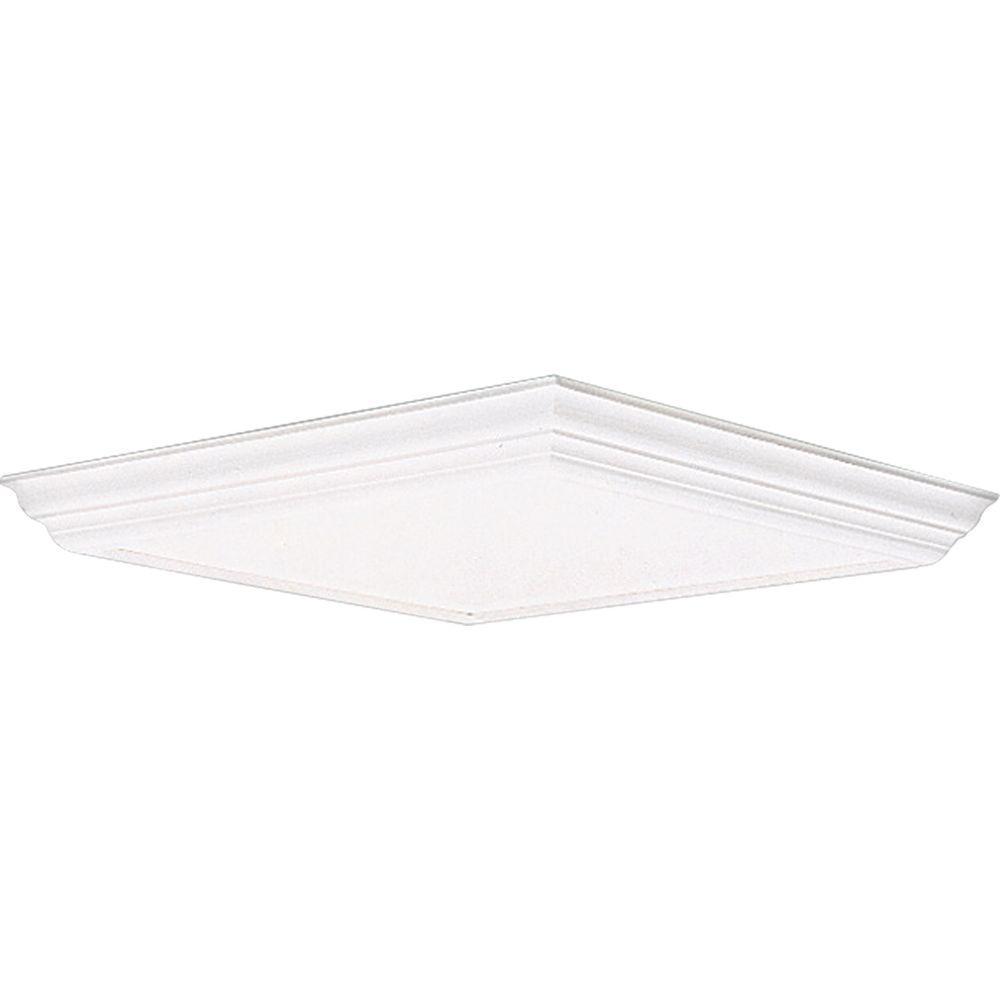 Traditional style crown molding frame surrounds a white acrylic diffuser to provide excellent general lighting in kitchens and other large rooms when paired with a Progress Lighting fluorescent fixture chassis (sold separately). Convenient lift-and-shift design permits easy access to light fixture for replacement of light bulbs or maintenance. Acrylic lens material resists UV to prevent yellowing and softens illumination for pleasing effect.
