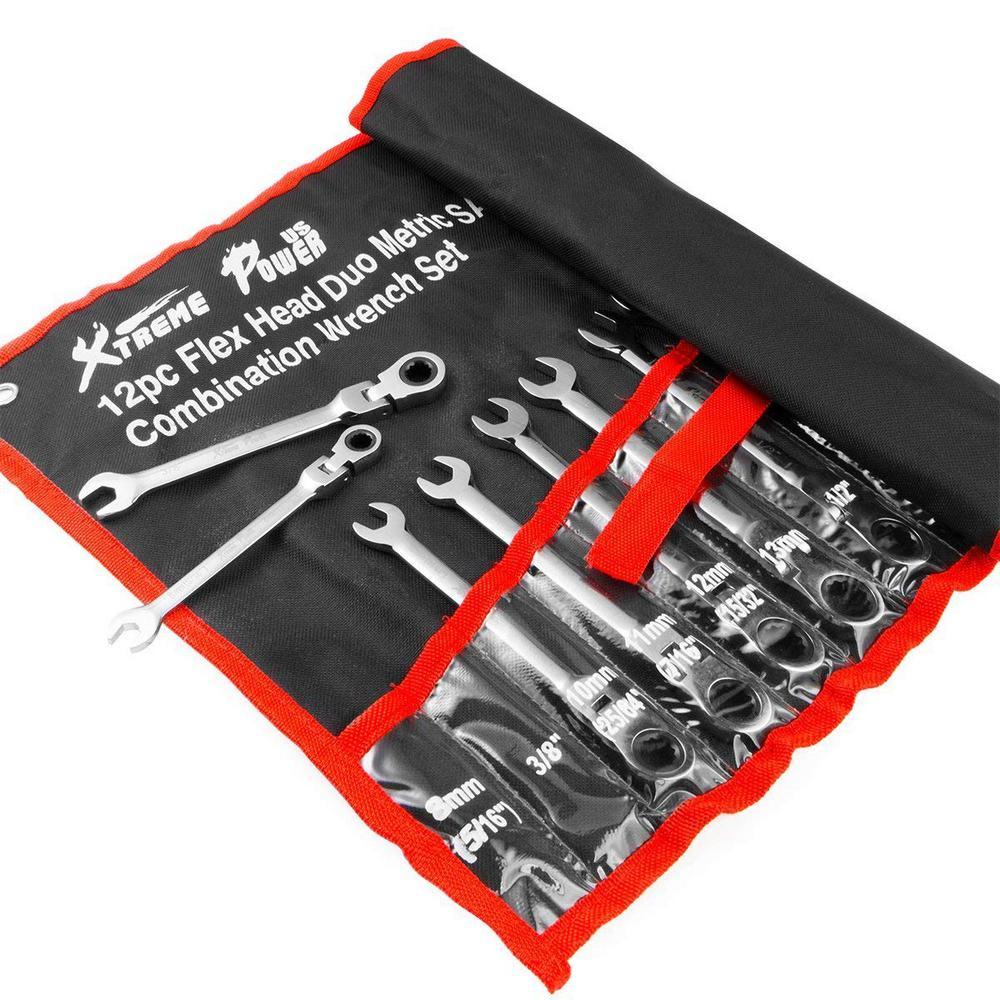 This Flex-Head SAE and MM Ratcheting Combination Wrench Set is a 12-piece collection of flex combination wrenches with v-groove open end and flexible ratcheting socket ends to accommodate the needs of professionals and serious DIY handymen. Use the ratcheting combination SAE and MM wrenches to attach and turn bolts, nuts and fasteners to desired positioning with superior leverage and consistent handling. The combination wrench set is CNC machine engineered from chromium-vanadium steel alloy by undergoing heat treatment and mirror chrome polished to have corrosion resistant and long-lasting durability. The flex head provides 180° of working angle with non-slipping grip and controlled leverage for hard to remove fasteners. The v-groove open ends provide improved contact with bolts and fasteners to preventing rounding. These ratcheting wrenches are made to withstand both high torque and force without distorting shape of tools. In addition, the wrench set includes a tool pouch with interior compartments to keep your tools clean and organized.