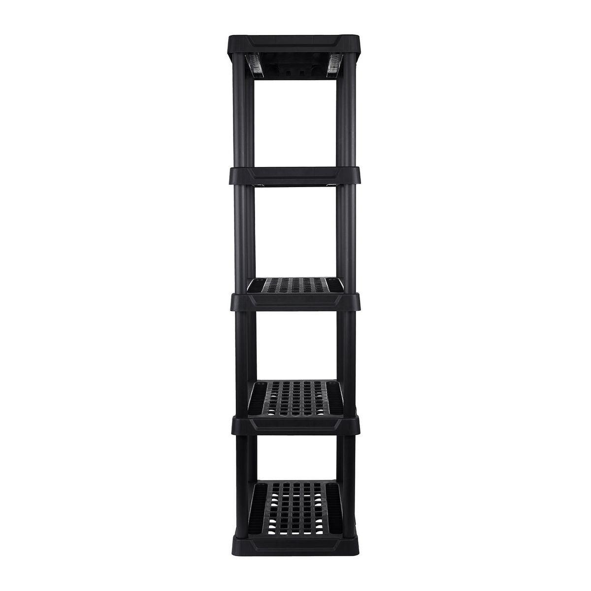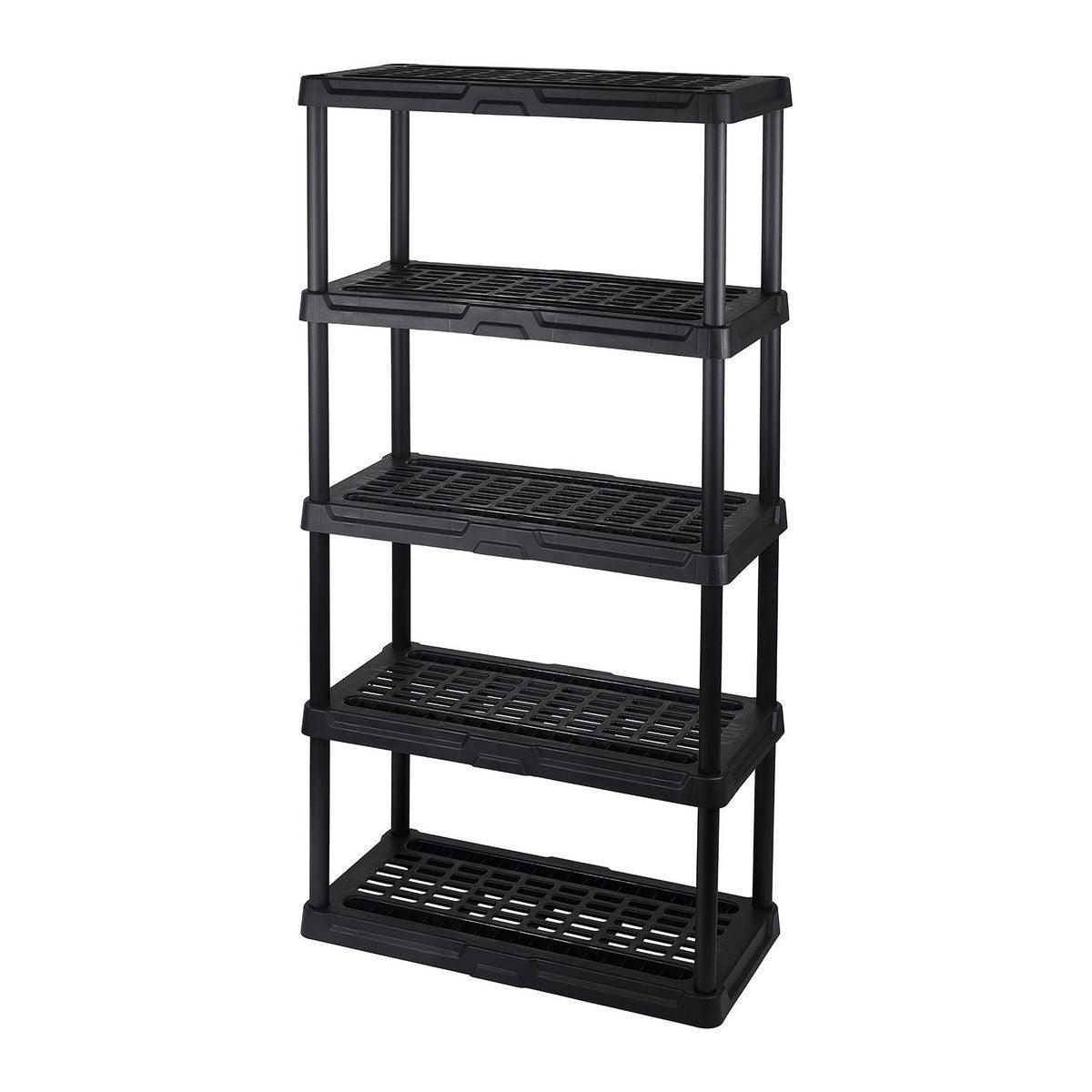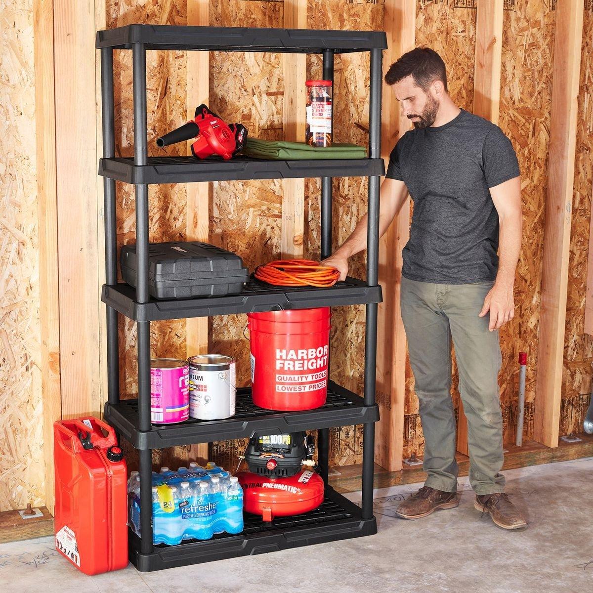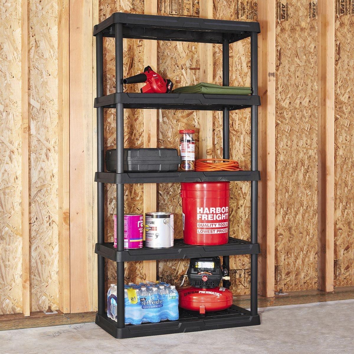 This 5-tier storage rack is designed to free up space in any shop or garage. Constructed from durable polypropylene, the rack won't dent, rust or peel. The shelves are engineered to hold up to 150 lb. each.