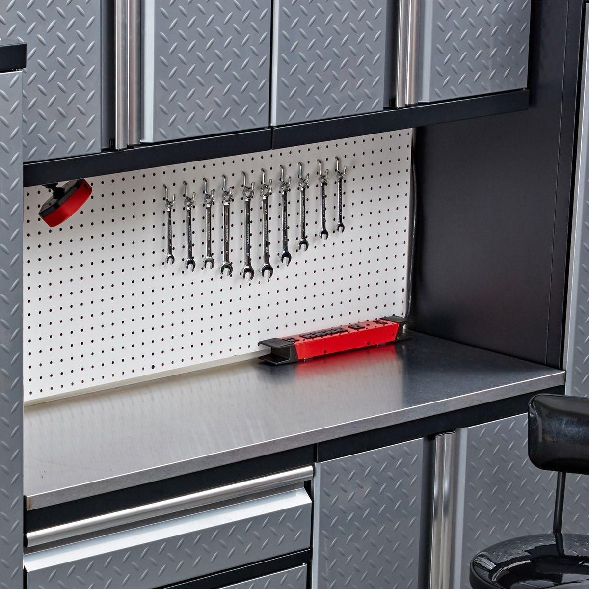 Designed for Yukon® 27 in. garage cabinets, this workbench top provides a smooth, durable work surface. Constructed of tough, rust-resistant stainless steel and engineered wood.