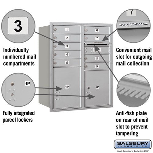 This recessed mounted mailbox offers secure mail storage with 10 compartments and 2 parcel lockers, designed for indoor or outdoor use. Constructed from heavy-duty aluminum with a durable powder-coated finish, it meets USPS standards and includes advanced security features.