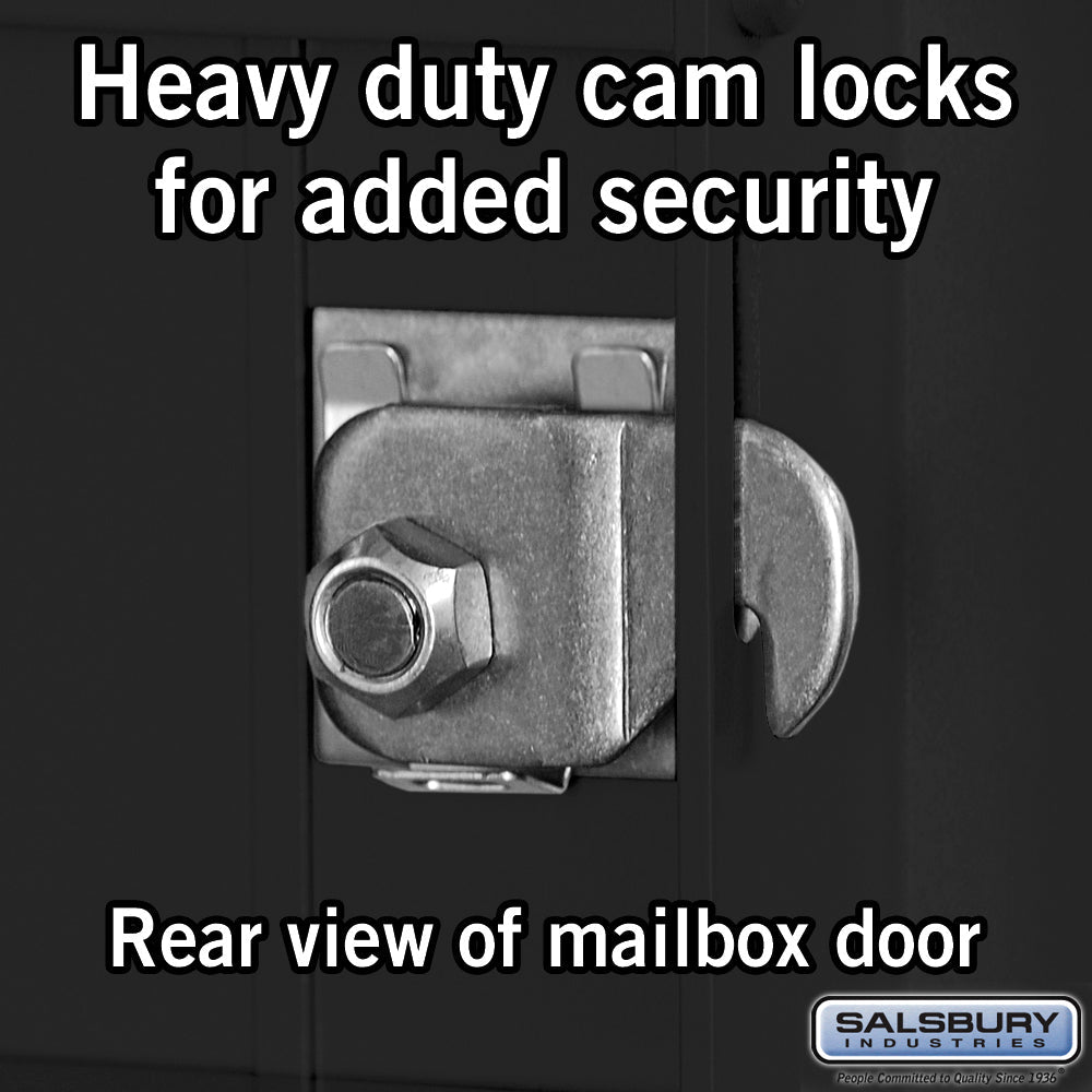 A: The mailbox features heavy-duty cam locks with dust/rain shields for added security.