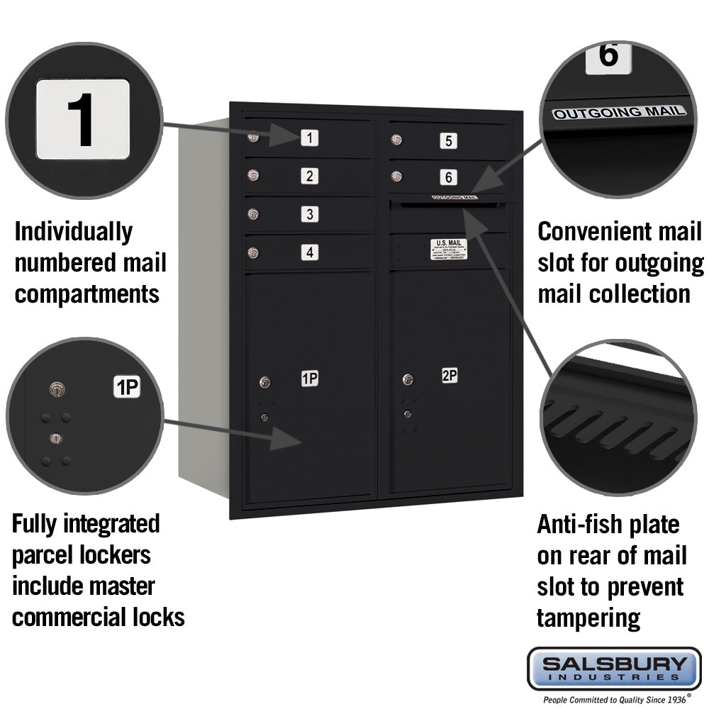 A: This mailbox has 6 mail compartments and 2 parcel lockers.
