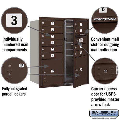 This recessed mounted 4C horizontal mailbox features 10 tenant compartments and 2 parcel lockers, designed for USPS access and front loading. Constructed from heavy-duty aluminum with a durable bronze powder-coated finish, it is ideal for residential and commercial use.