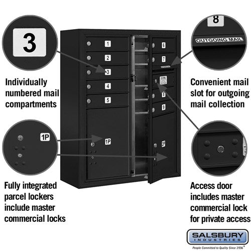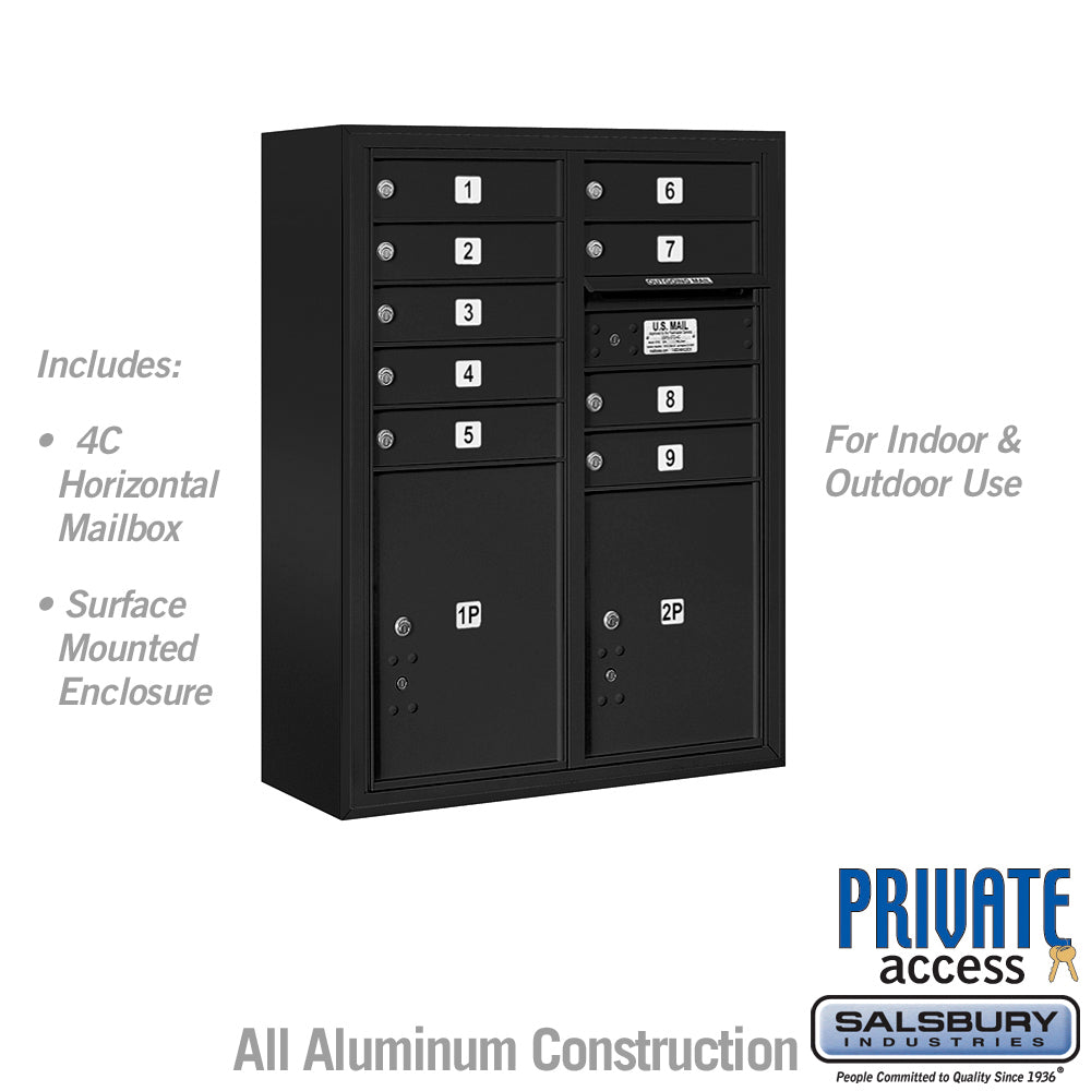 This 10-door high surface-mounted mailbox is designed for private access and features 9 mail compartments and 2 parcel lockers. Constructed from heavy-duty aluminum with a durable powder-coated finish, it is suitable for both indoor and outdoor use.