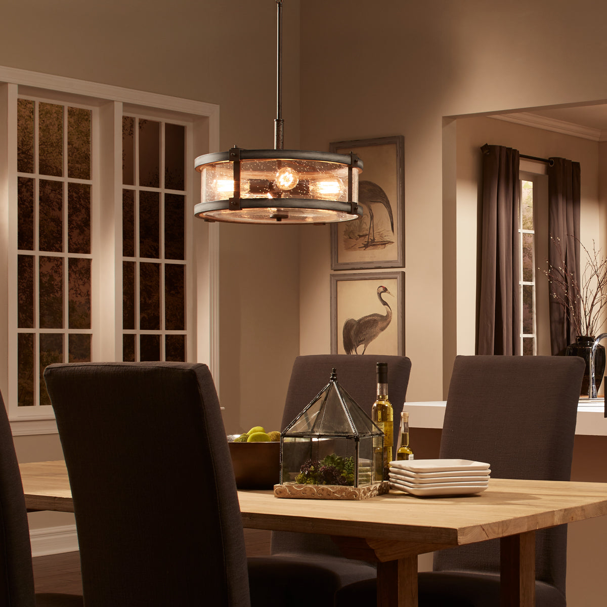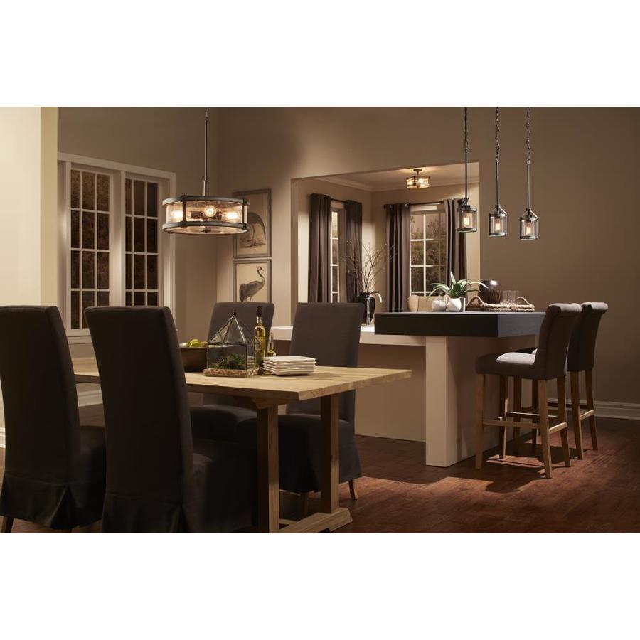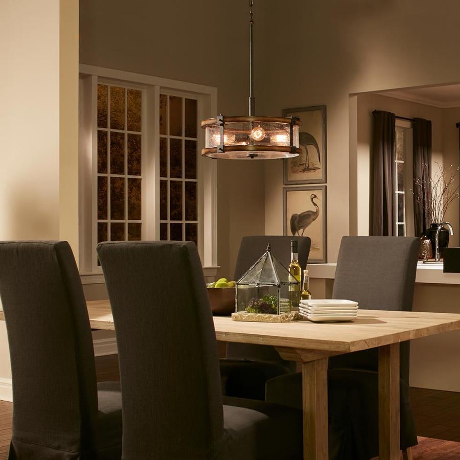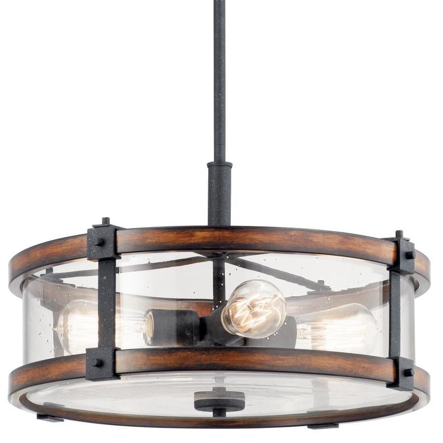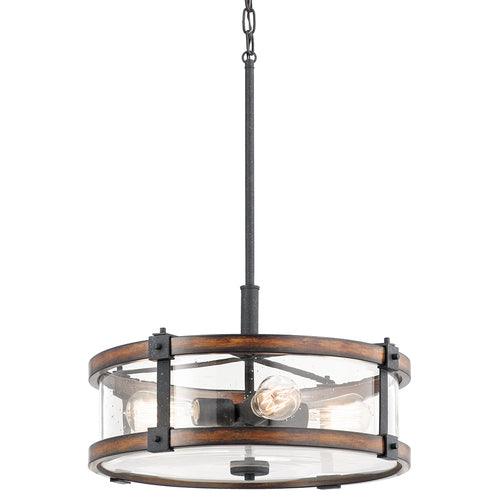 The Kichler Barrington drum pendant blends anvil iron with distressed wood tones and clear seeded glass for warm, rustic ambiance. Its 18-inch diameter and four medium-base sockets deliver ample illumination, ideal for dining rooms or kitchens.