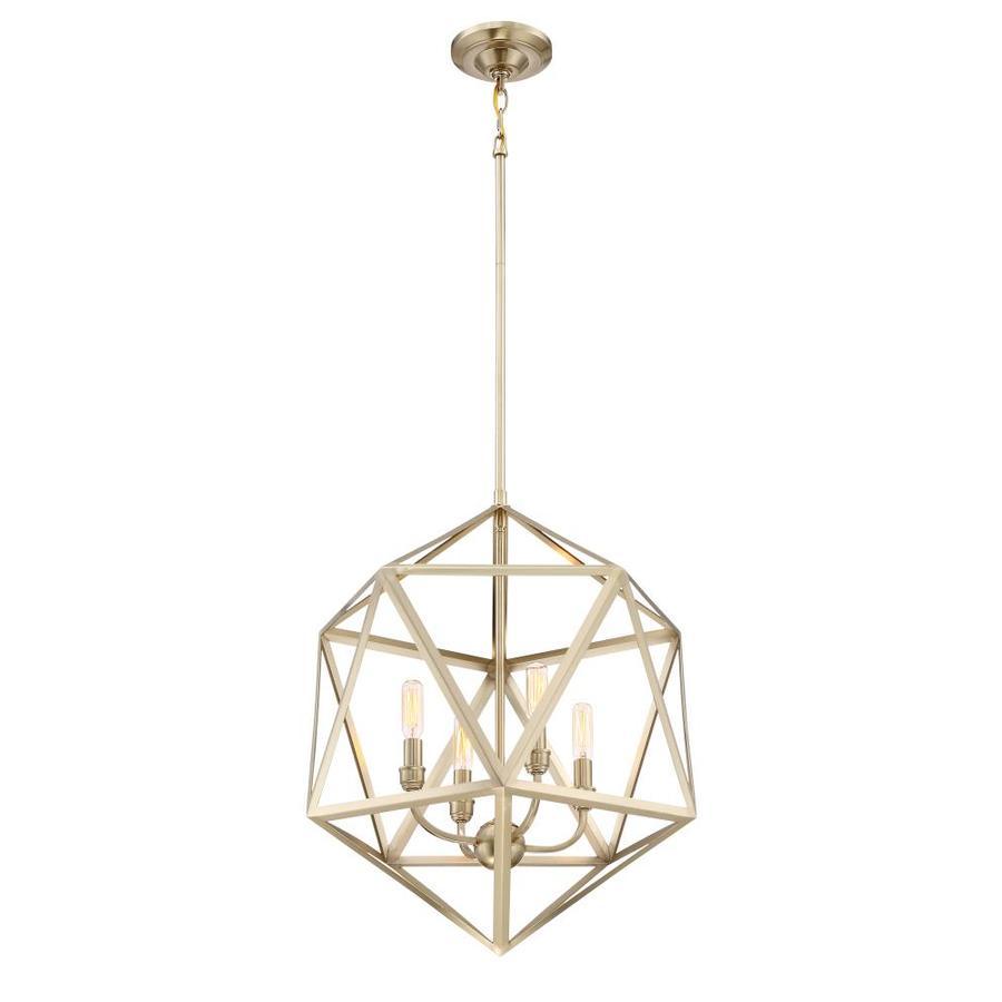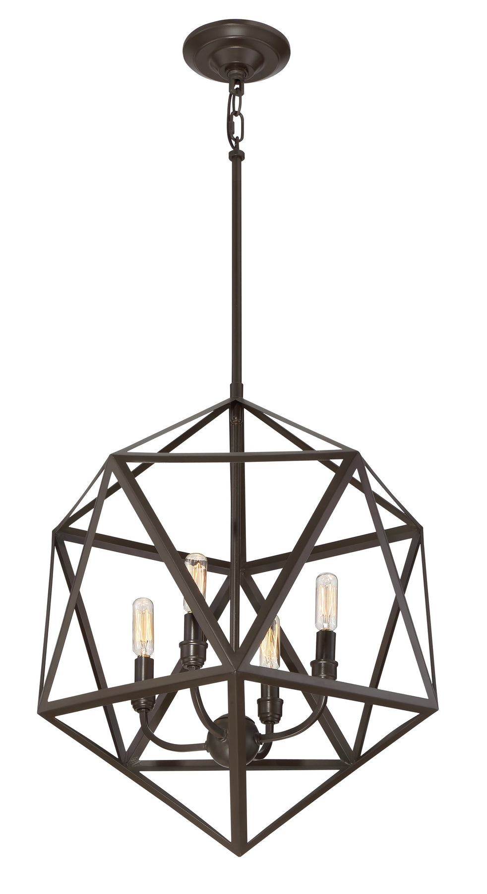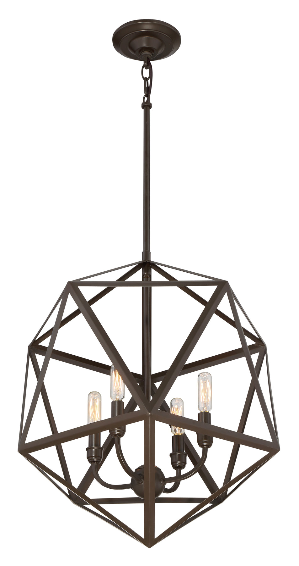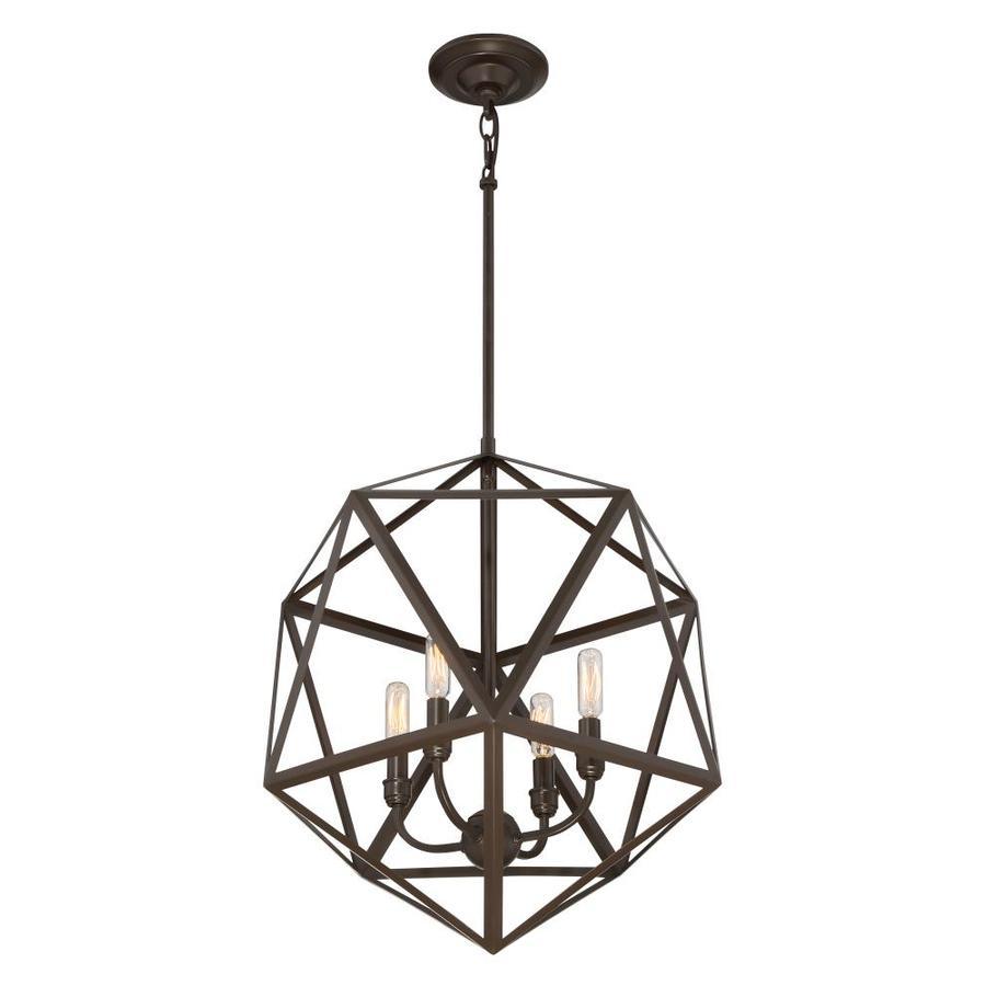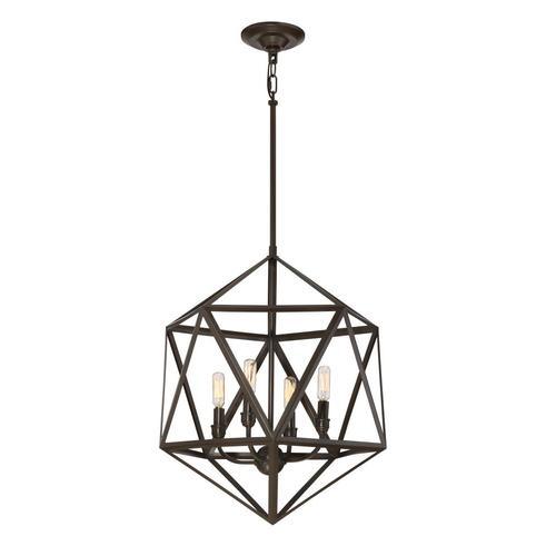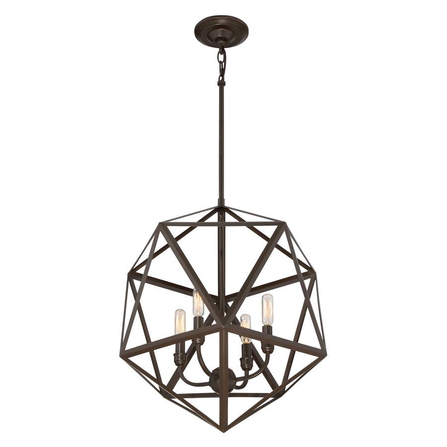The Quoizel Liberty Park pendant showcases an open geometric metal cage in a rich bronze finish for striking industrial style. Four candelabra sockets create warm, dimmable illumination, and adjustable downrods set a hanging height from 28 to 64 inches—perfect over dining tables, islands, or entryways.