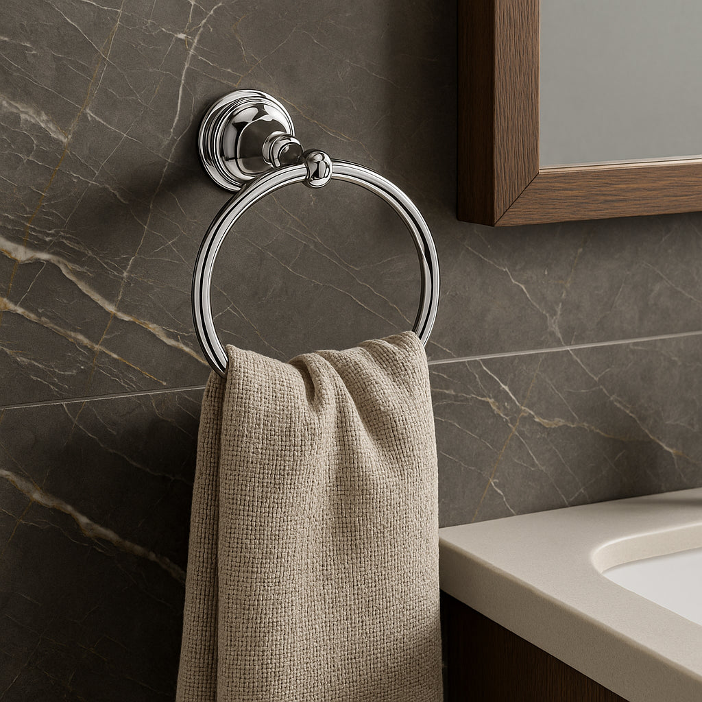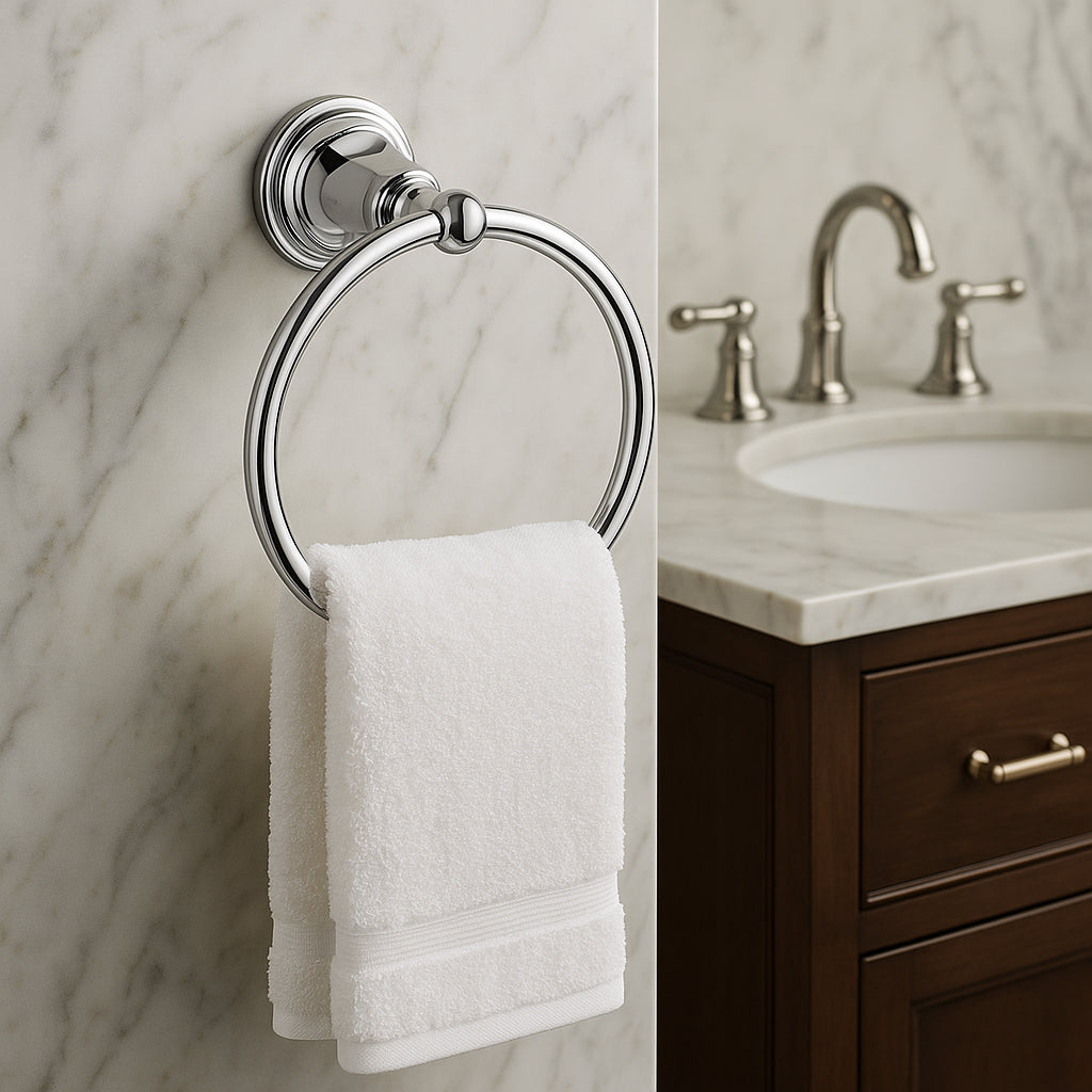 Enhance your bathroom with the Kelston Polished Chrome Wall Mount Towel Ring, a blend of durability and elegance.