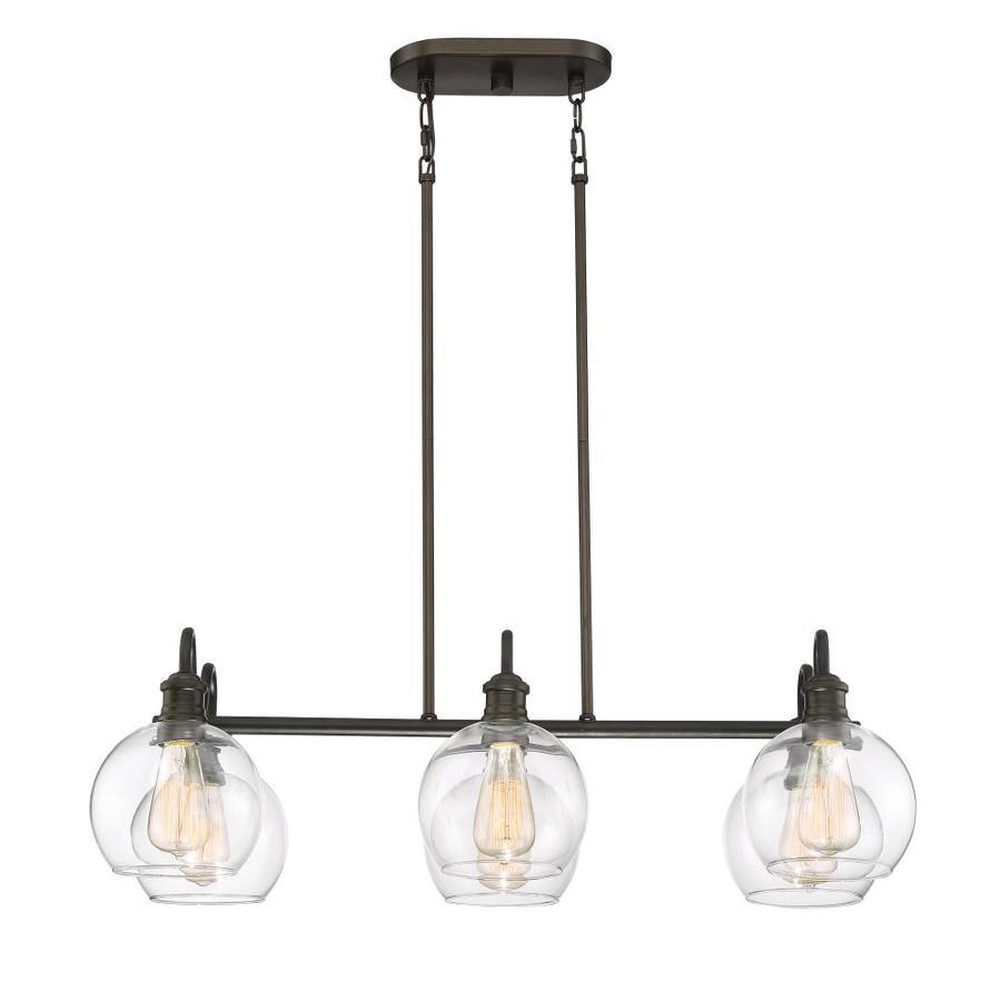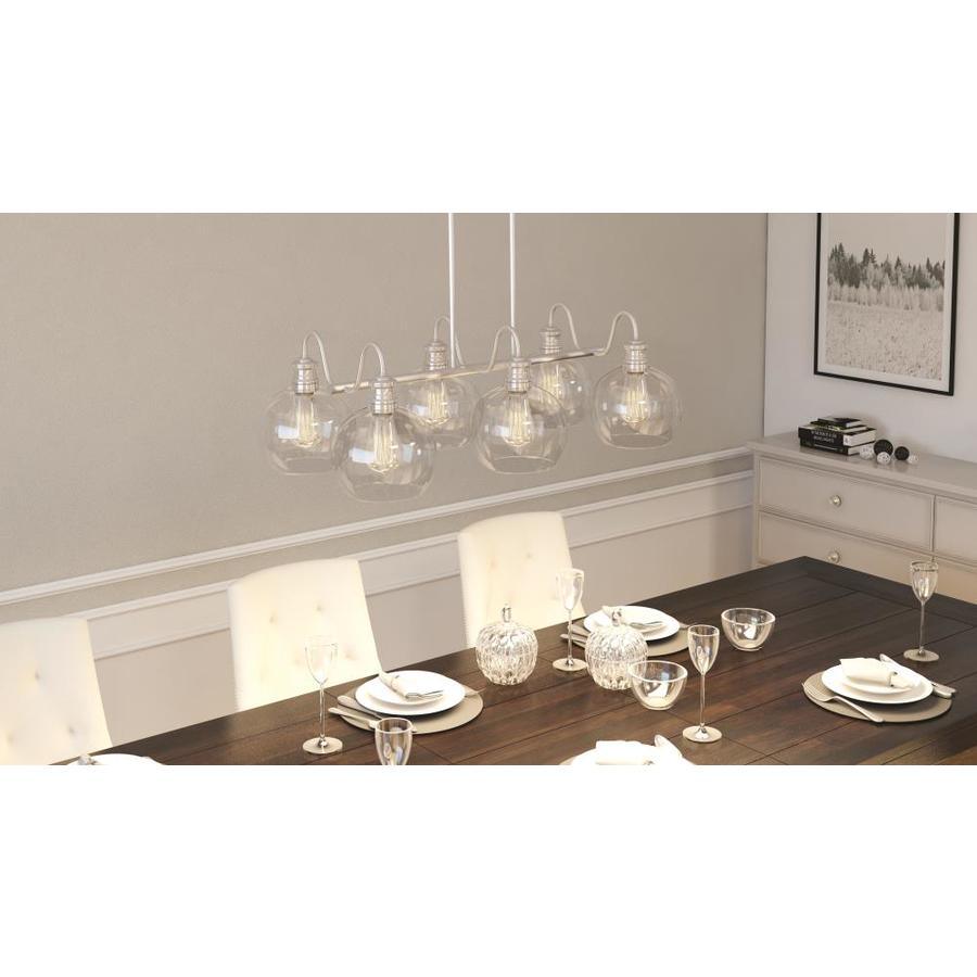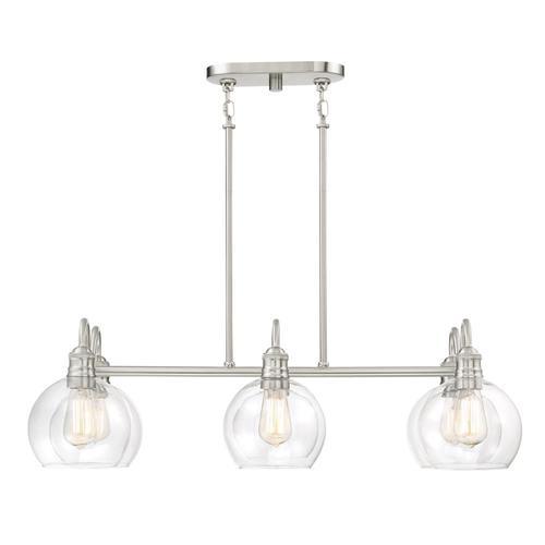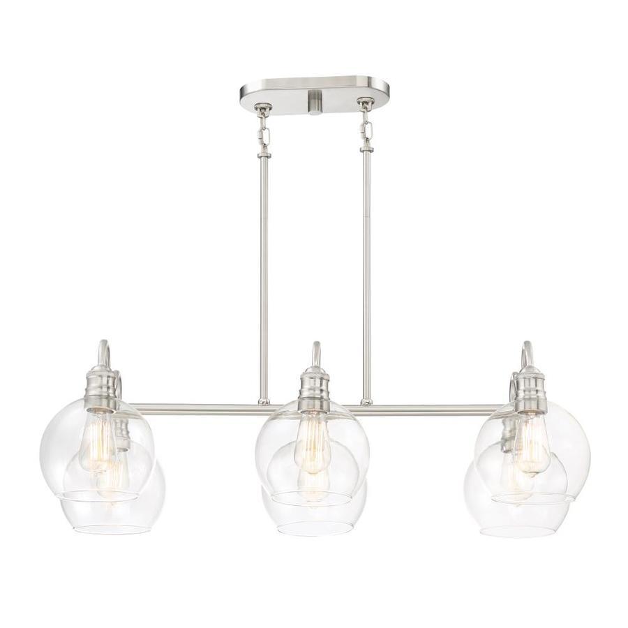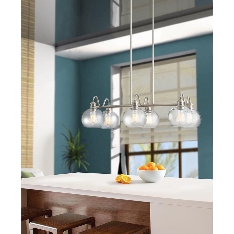 A transitional linear island light from Quoizel’s Soho collection featuring a brushed nickel finish and clear glass globes. Hardwired and damp rated, it uses six medium-base bulbs for bright, customizable illumination over kitchen islands or dining spaces.
