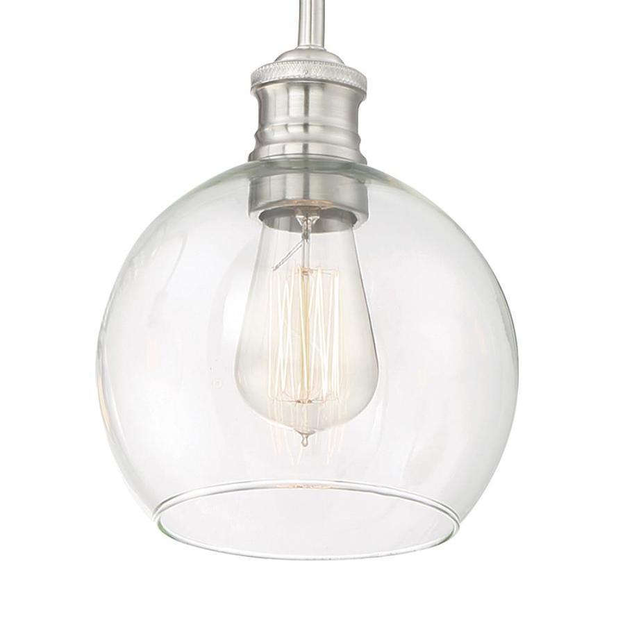 Transitional Design: Brushed nickel finish paired with mouth-blown clear glass globes for vintage-meets-modern appeal