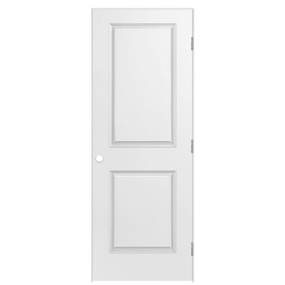 This Masonite Traditional interior door features a smooth, 2-panel square design with a primed molded composite surface ready for paint. The hollow-core slab comes prehung in a flat jamb with satin nickel hinges for quick, clean installation in bedrooms, bathrooms, and hallways.