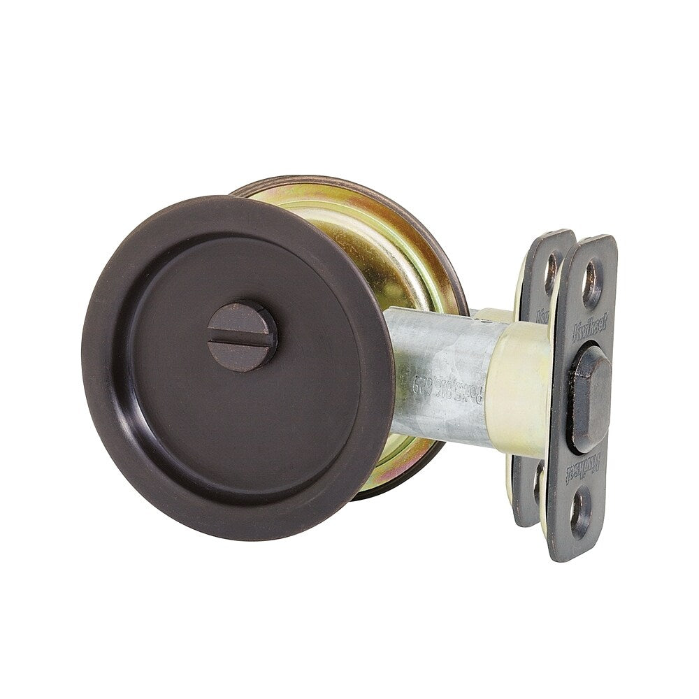A round, metal pocket door pull by Kwikset designed for sliding interior doors without a lock. Fits standard 2-1/8-in drilled doors for quick installation and features a durable Venetian bronze finish.