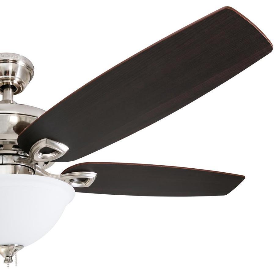 The Harbor Breeze Coastal Creek 52-inch ceiling fan delivers quiet, reversible airflow and warm illumination for large indoor rooms. Finished in brushed nickel with reversible toffee/cocoa blades, it includes a frosted glass bowl light kit with two A15/E26 LED bulbs and versatile mounting options.