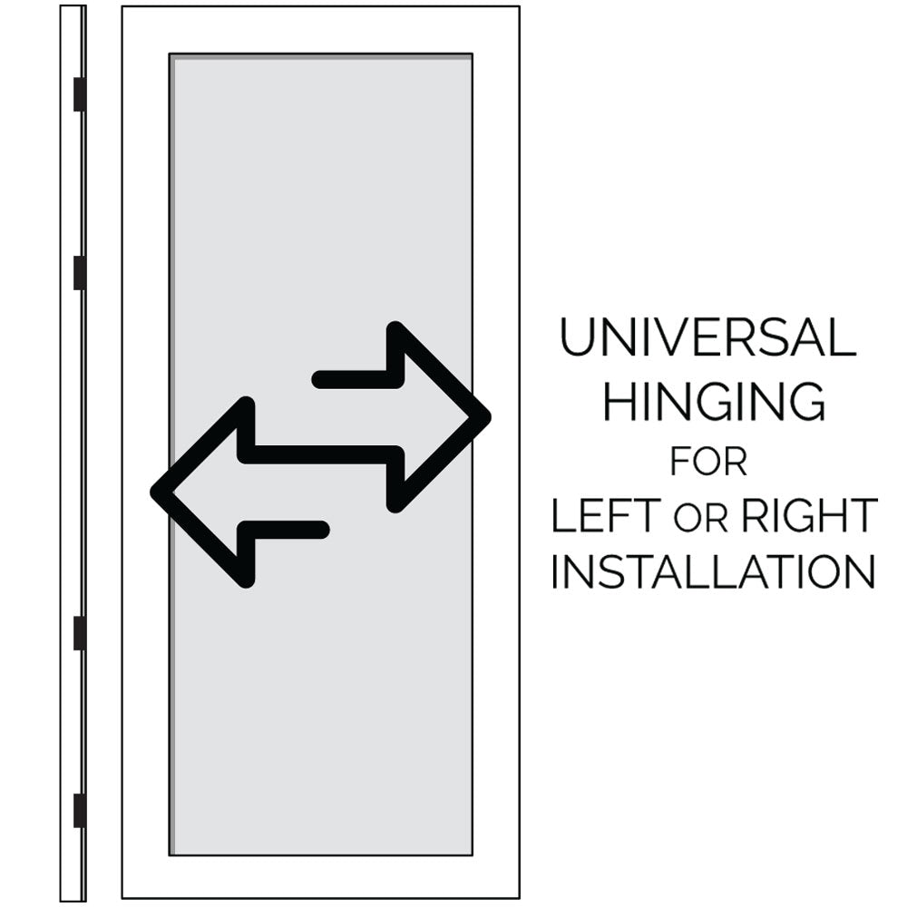 Q: Can the door be hinged on either side? A: Yes. It features universal/reversible hinging for left or right installation.