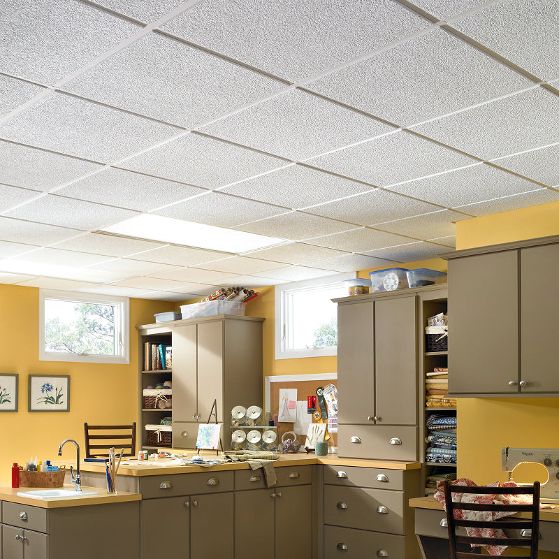 High-performance mineral fiber ceiling panels with a subtle plaster finish for 15/16" drop ceilings. Designed for sound control and durability, these 24" x 24" tiles install in the PRELUDE 15/16 suspended ceiling system.