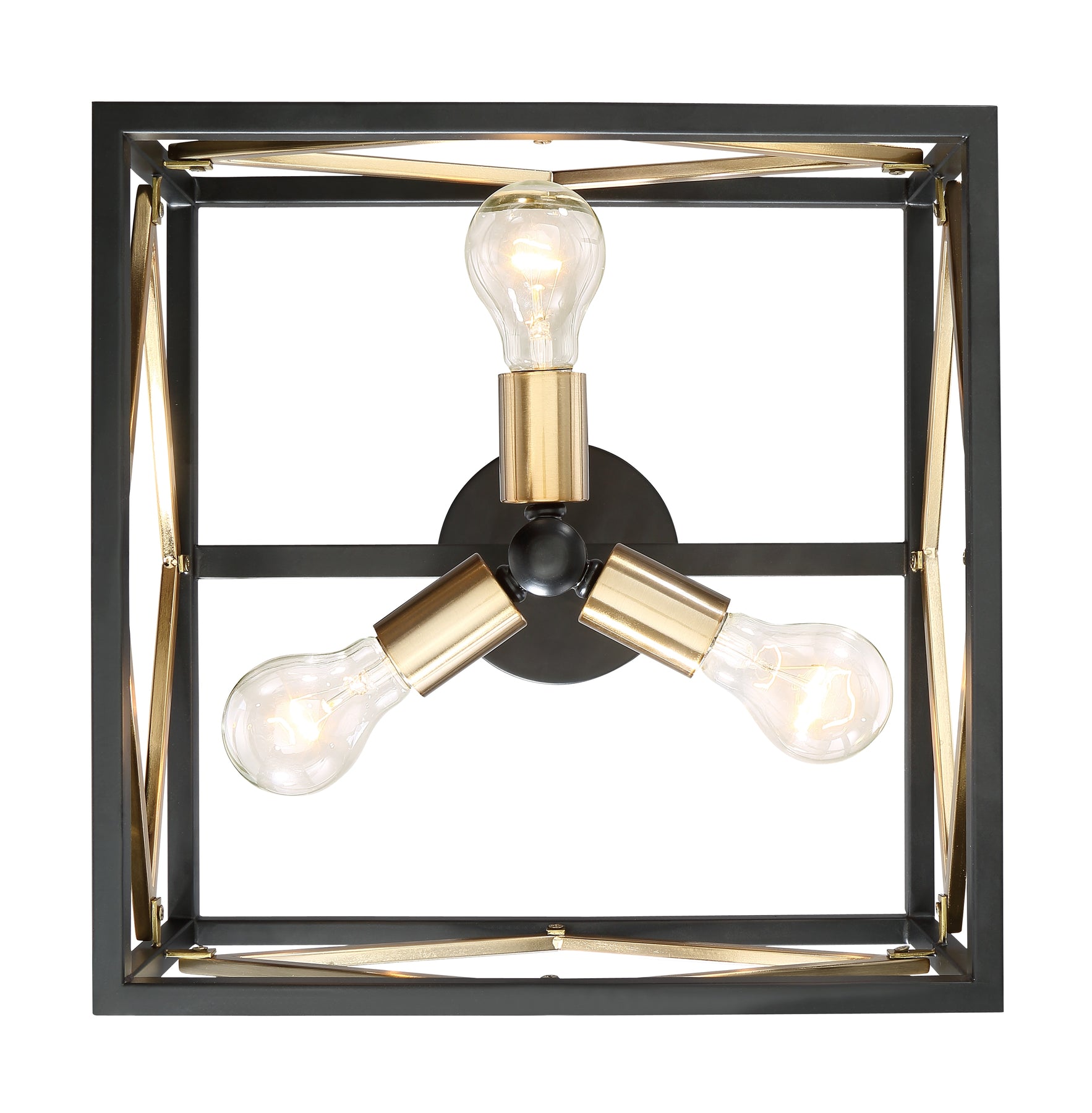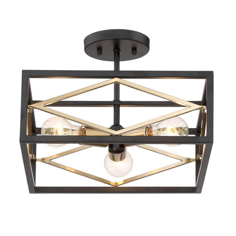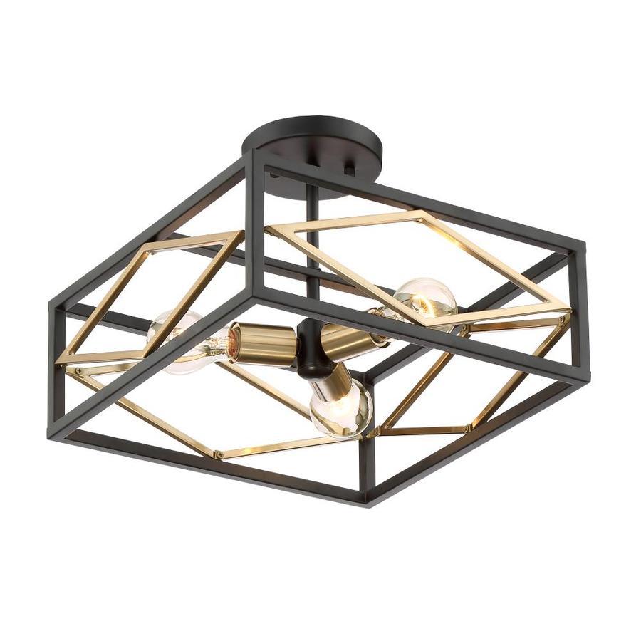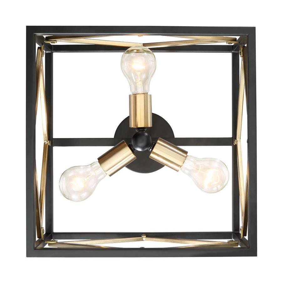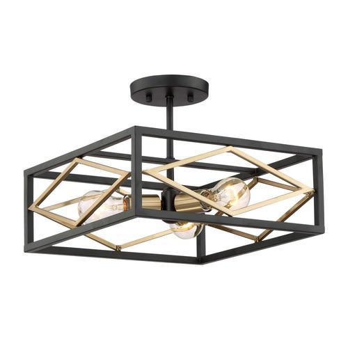 A bold, geometric semi-flush mount from Quoizel’s Platform collection, finished in matte black with gold accents. The open square frame showcases three medium-base bulbs for bright, modern illumination ideal for indoor damp-rated spaces.