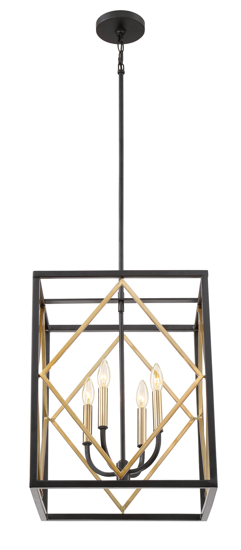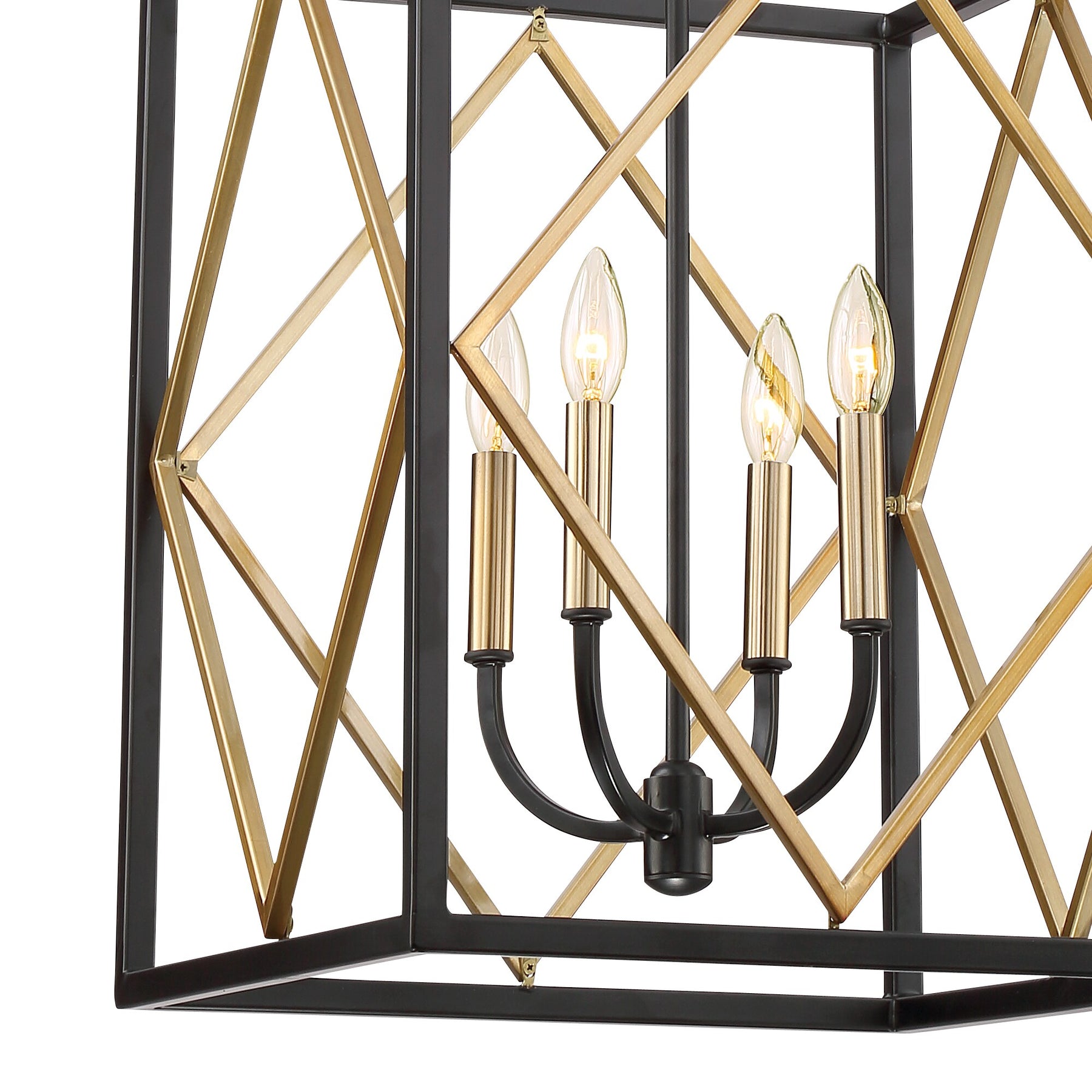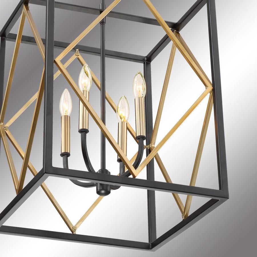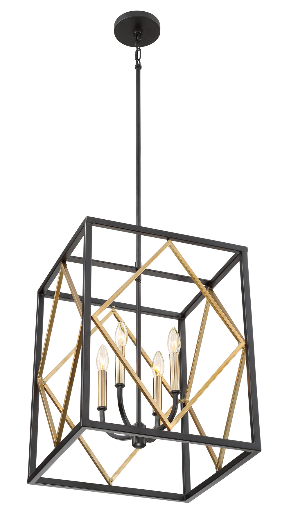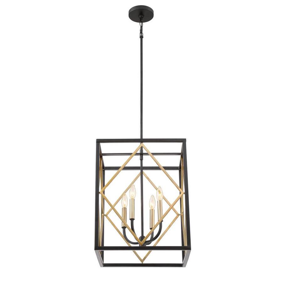 A bold geometric pendant from Quoizel’s Platform collection, finished in black with gold accents. This medium square fixture features four candelabra sockets, clear mouth-blown glass, and adjustable downrods for customizable hanging height.