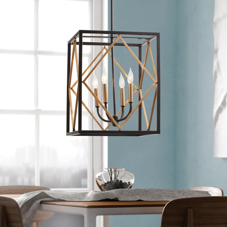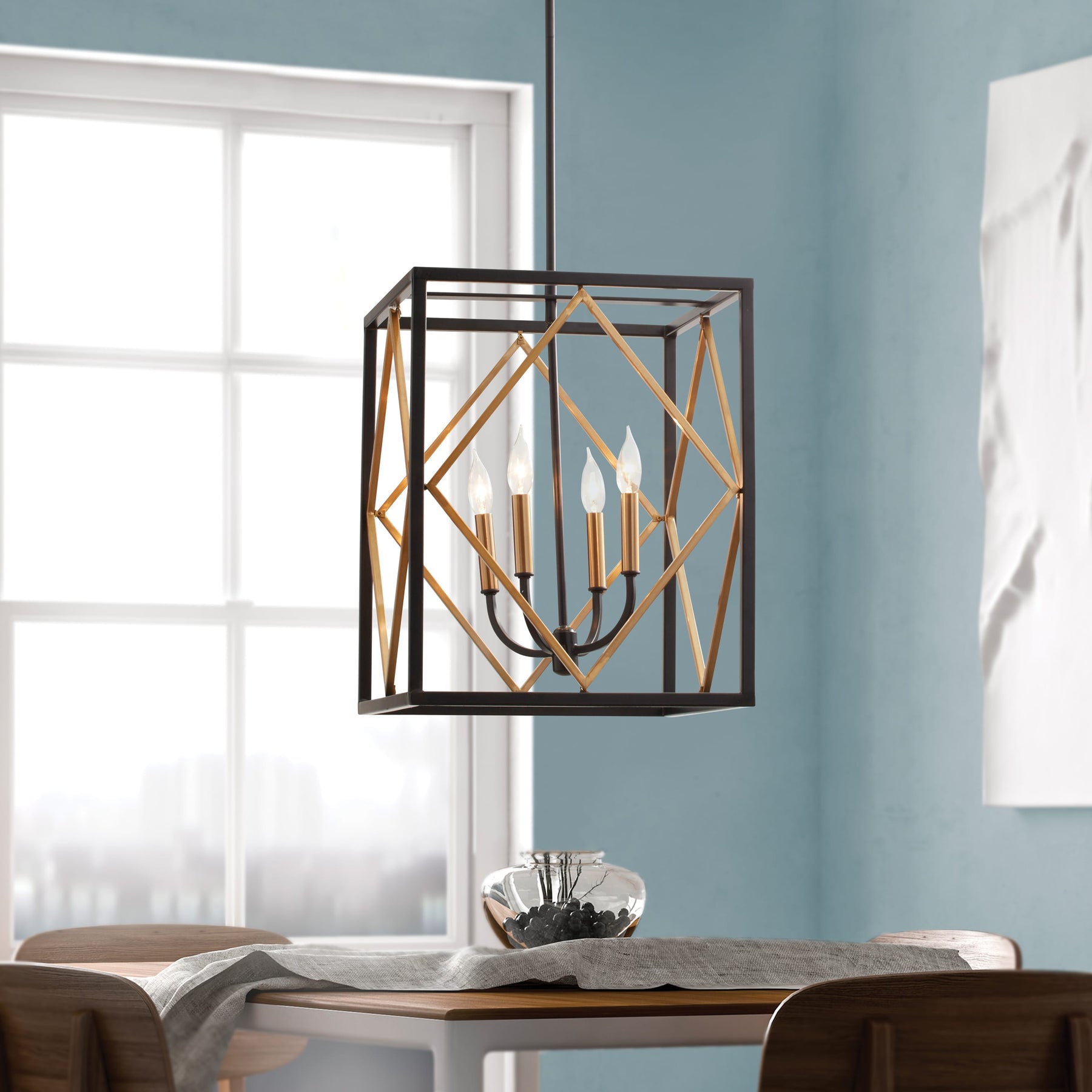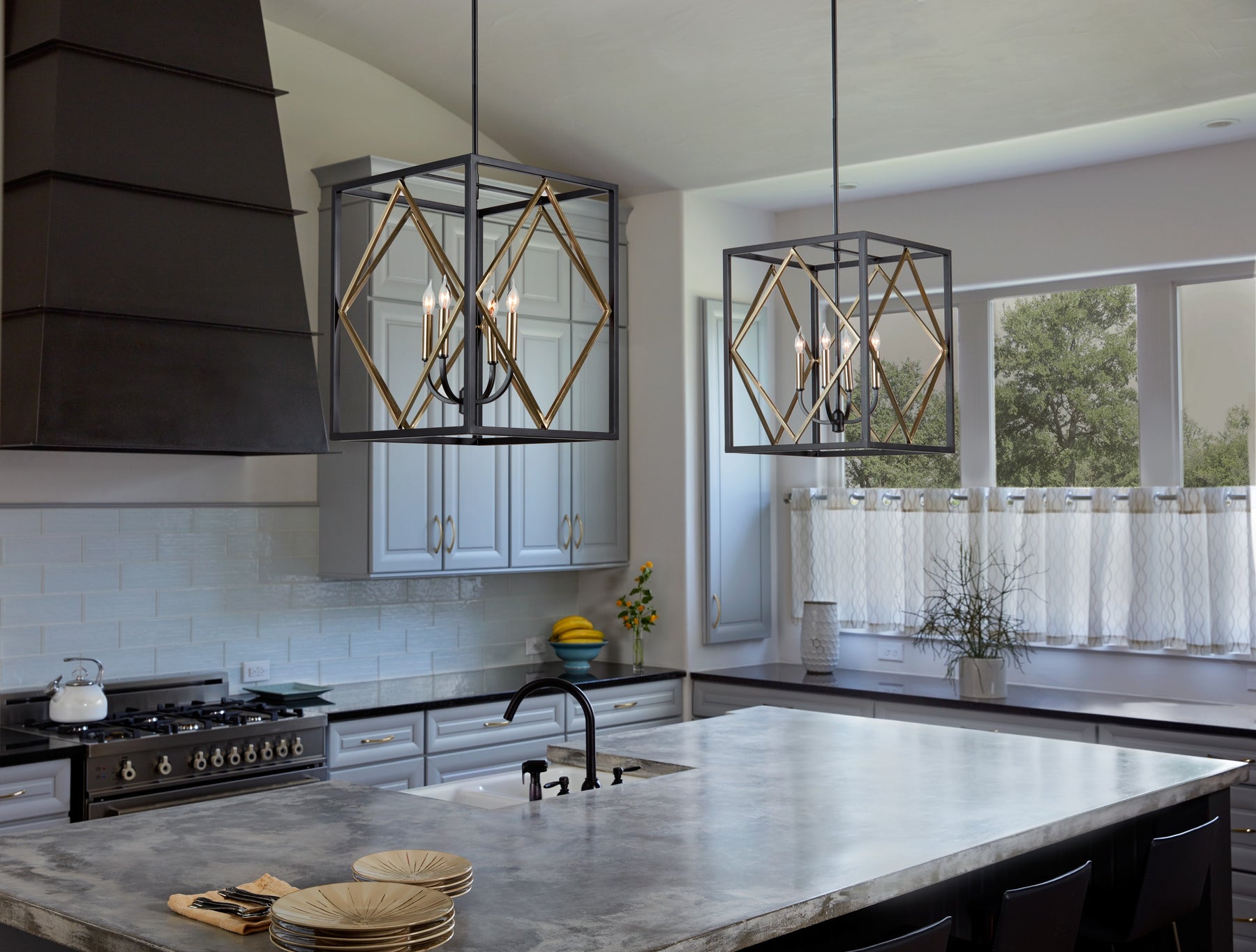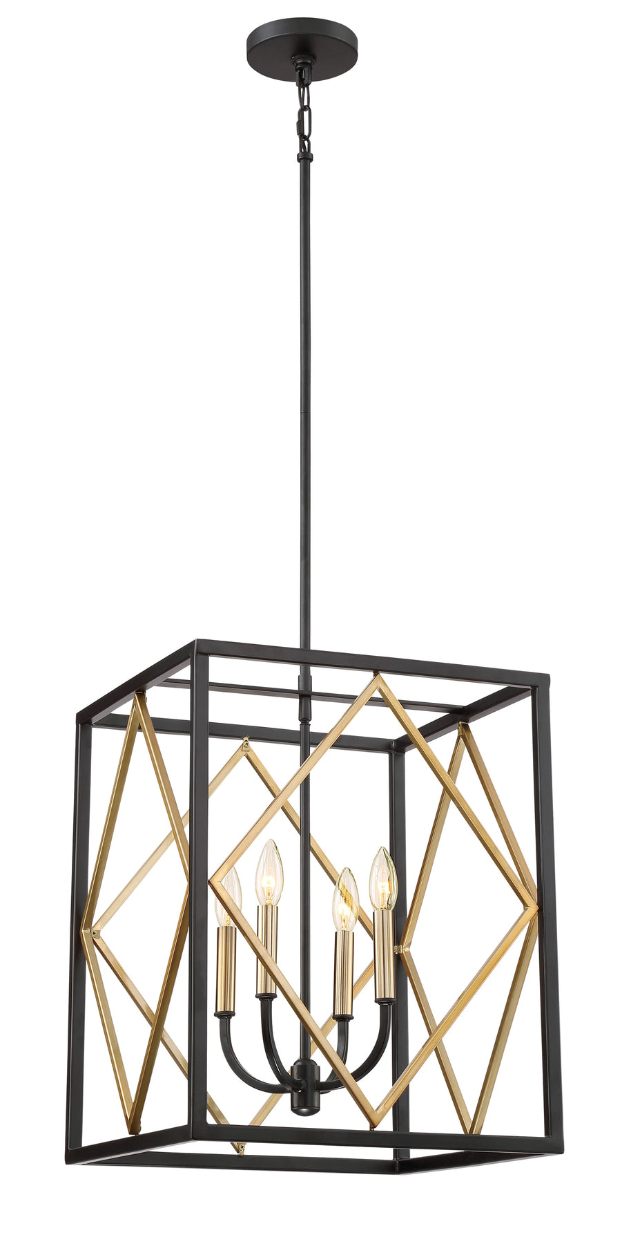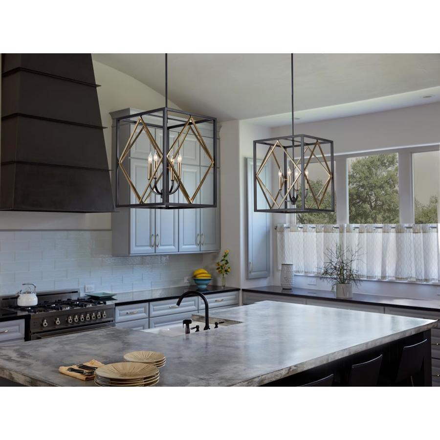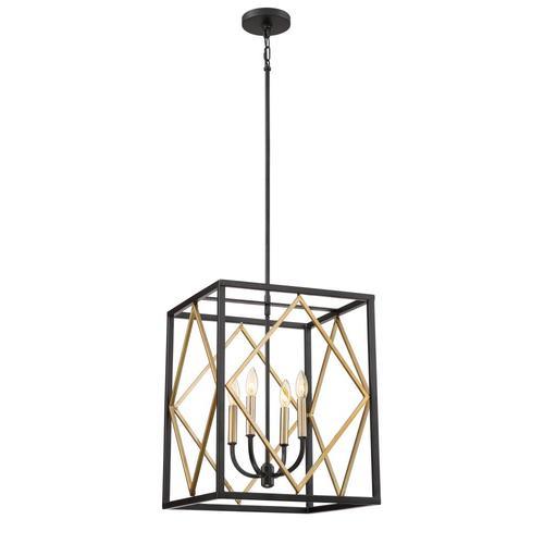 A bold geometric pendant from Quoizel’s Platform collection, finished in black with gold accents. This medium square fixture features four candelabra sockets, clear mouth-blown glass, and adjustable downrods for customizable hanging height.