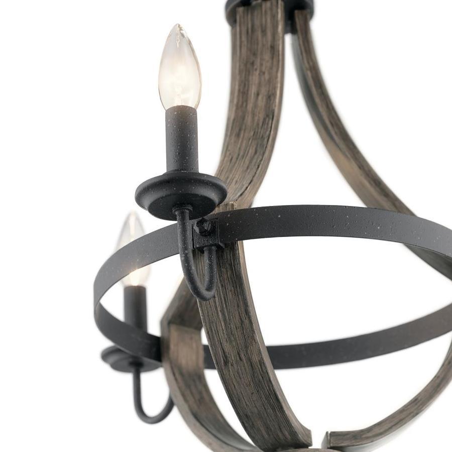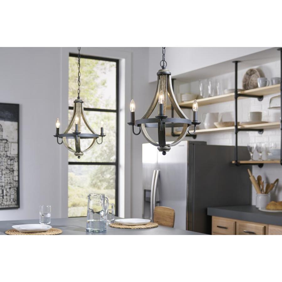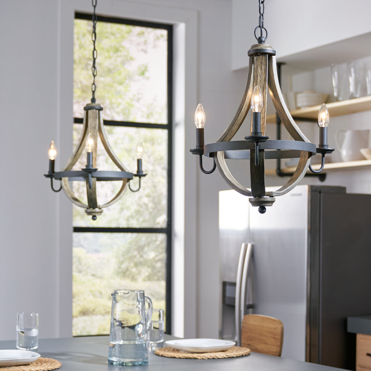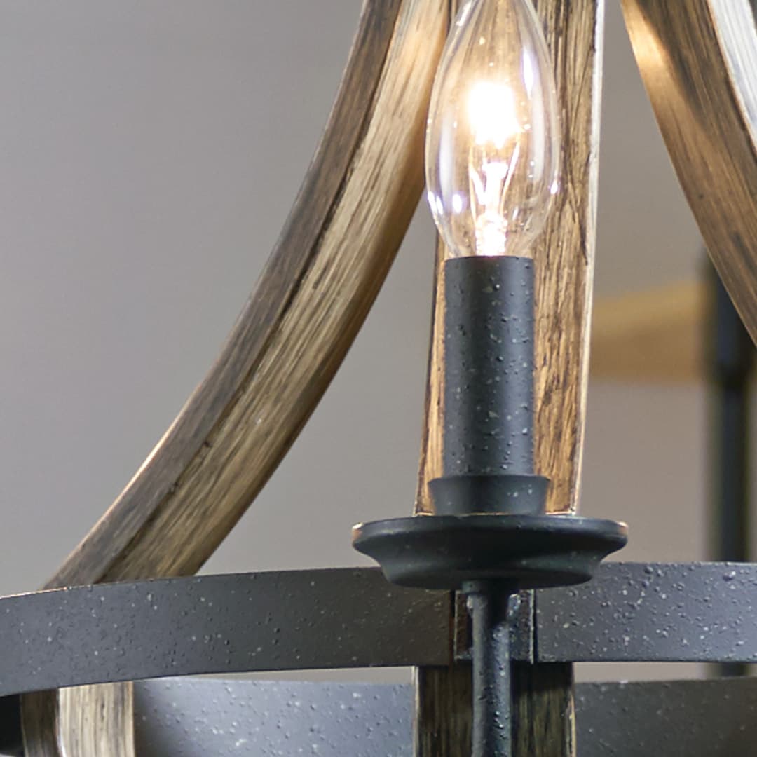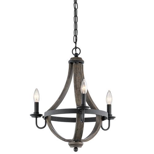 A rustic-inspired 3-light chandelier that blends distressed black metal with wood tones, evoking vintage wine barrels. Compact at 18.7 inches in diameter, it delivers warm, character-rich illumination ideal for kitchens, dining rooms, and cozy living spaces.