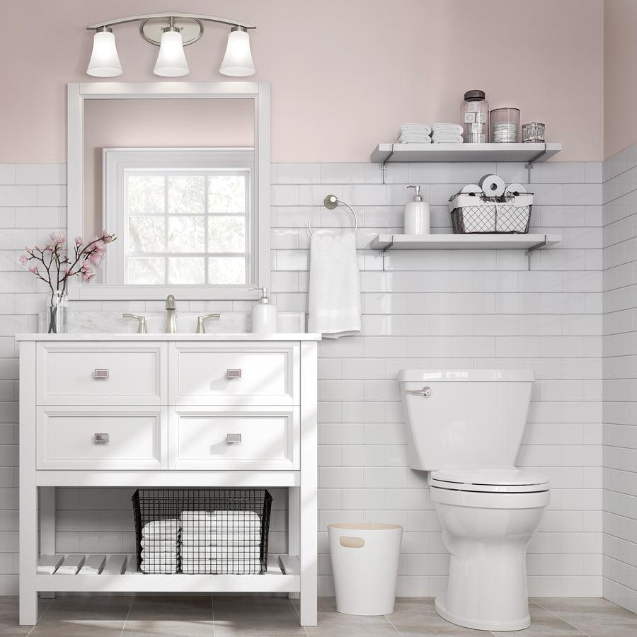 Open storage shelf offers extra space for towels and other bath accessories