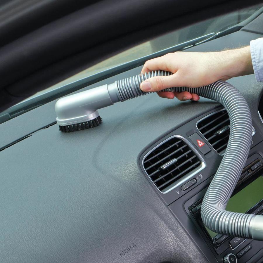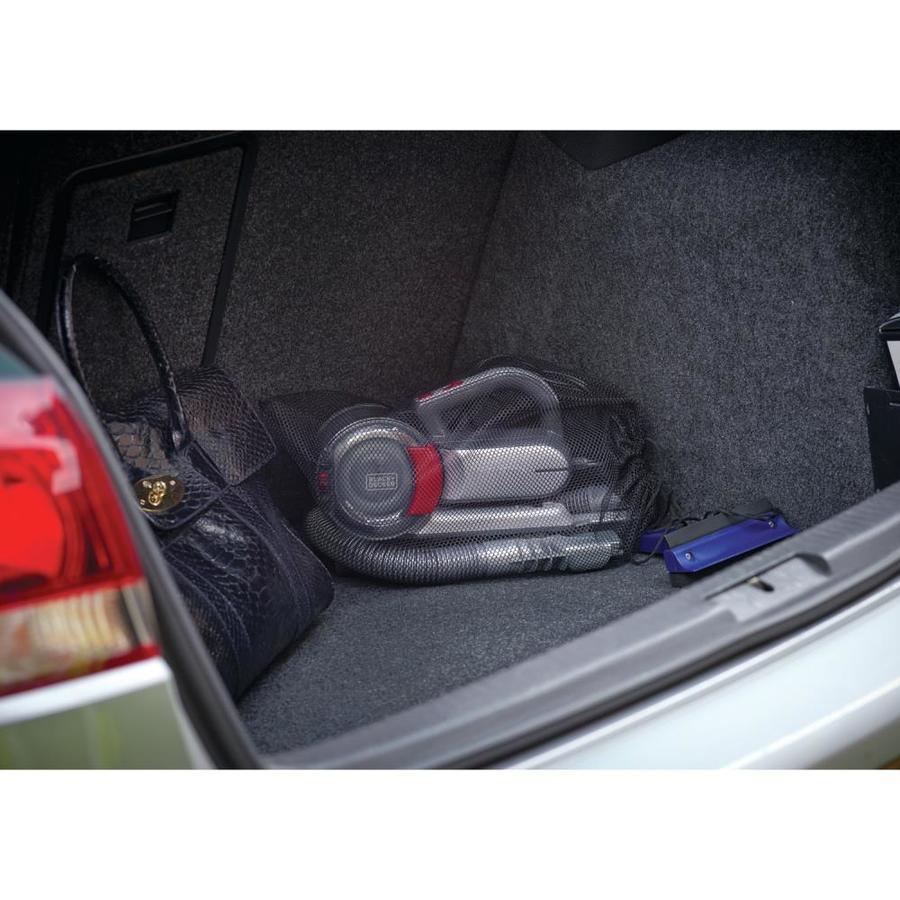 Includes hand vacuum, flexible hose, on board flip-up brush, extendable crevice tool, large soft brush and mesh storage bag