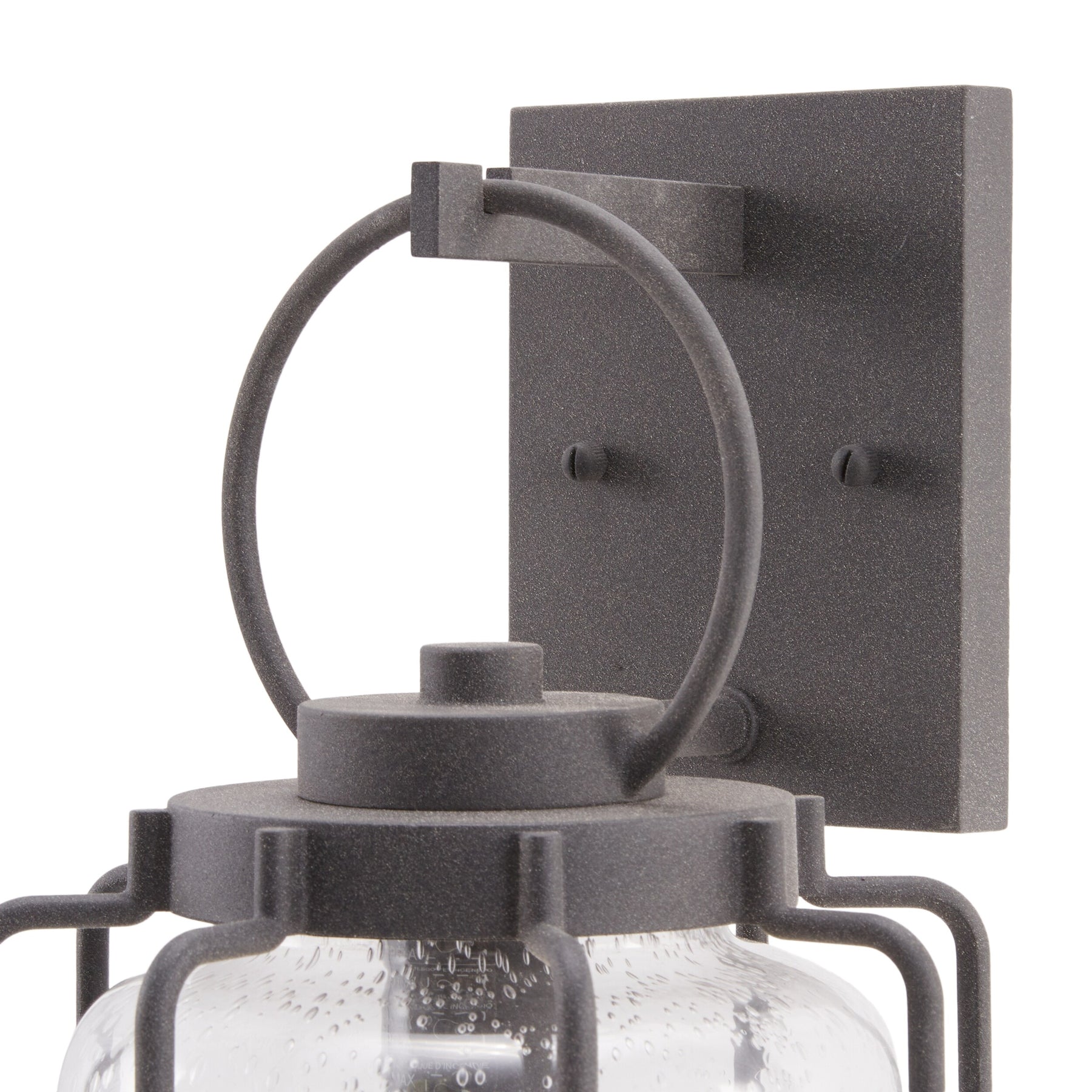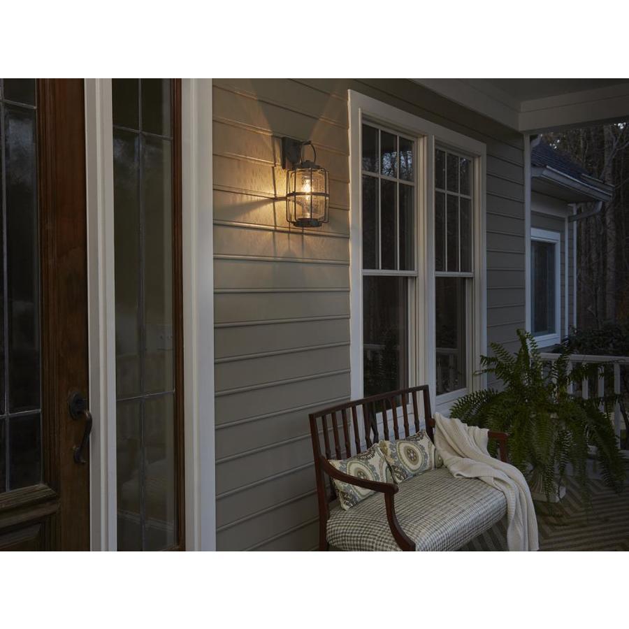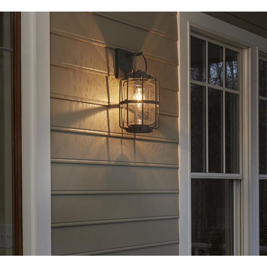 Industrial-inspired outdoor wall lantern from Kichler’s Montview collection, finished in Weathered Zinc with a clear seeded glass shade. Hardwired and wet-rated, it uses one medium-base bulb to cast warm, ambient light for porches, patios, and entryways.