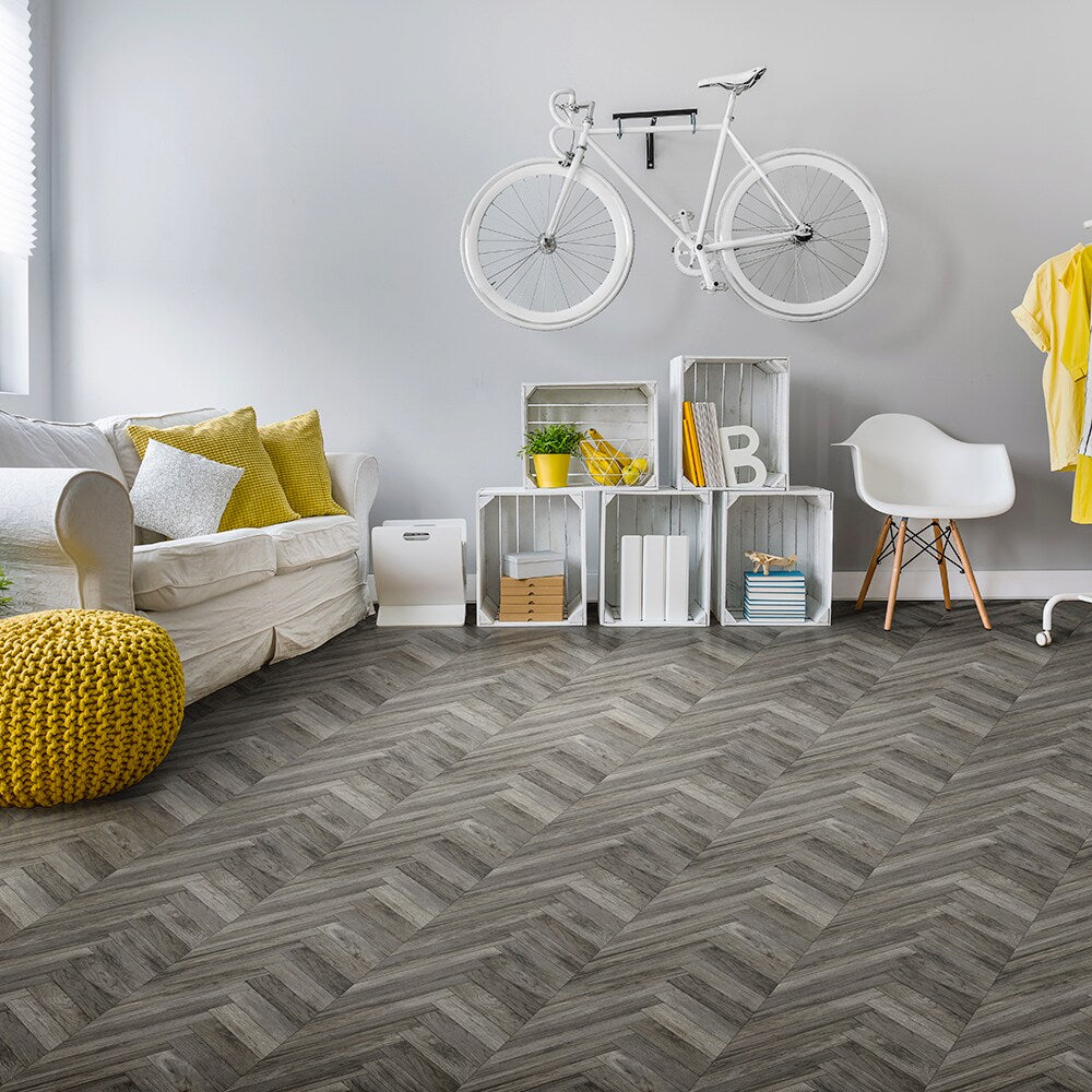 The Porpoise wood-look chevron sweeps across a room with tailored movement, bringing chic rhythm to modern living spaces. Its matte texture softens light while the layered grays evoke weathered timber—organic yet refined. Pair it with crisp whites and a pop of mustard or charcoal metals to let the pattern sing. A luxurious foundation that elevates everyday rooms with effortless polish.