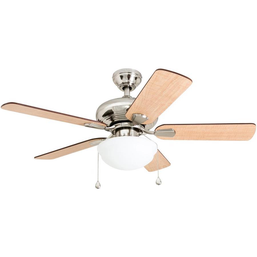 A versatile 52-inch indoor ceiling fan featuring a brushed nickel motor housing, reversible auburn/blonde blades, and an opal frosted glass globe light. Includes a 6.5W LED bulb, three speed reversible AC motor, and a 4-in downrod for large rooms up to 400 sq ft.