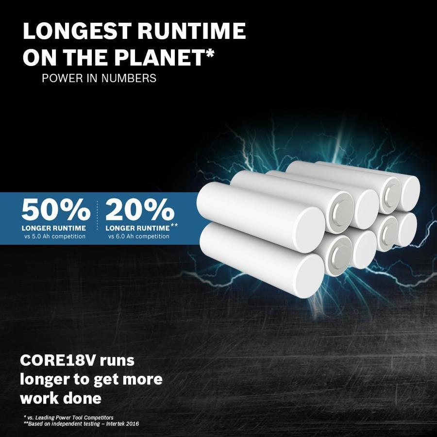 CORE18 V – includes the Bosch-exclusive CoolPack 2.0 technology, providing up to 135% more battery life than batteries without CoolPack