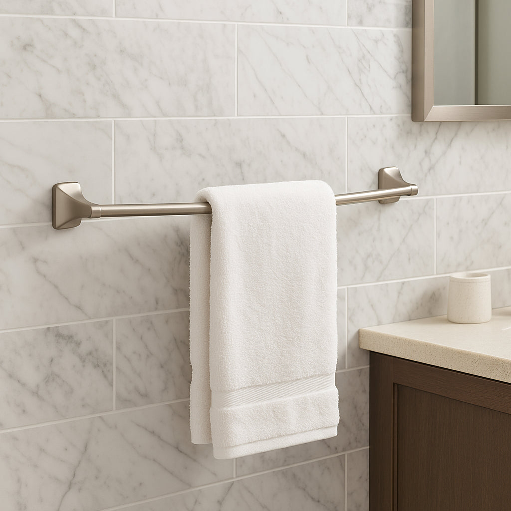 The KOHLER Maxton 24-inch towel bar combines contemporary design with premium durability. Featuring a brushed nickel finish, it resists tarnish and corrosion, ensuring long-lasting elegance.
