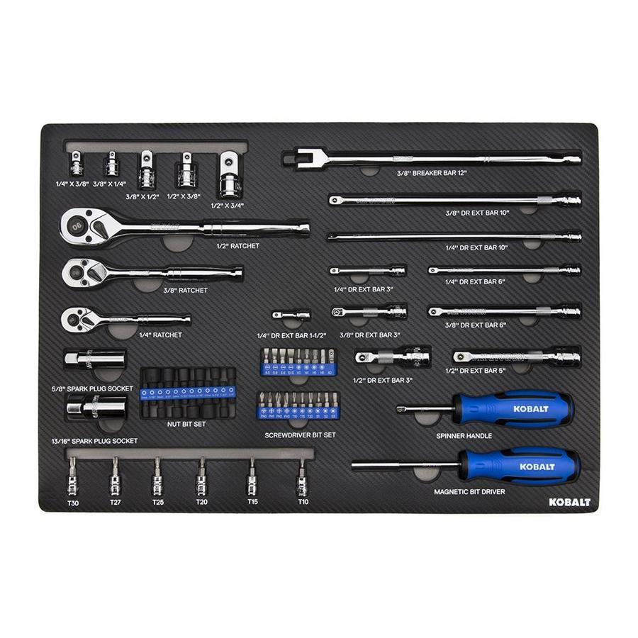 Also included are extensions and drive adapters, a breaker bar, two driver handles and hex keys, nut drivers, insert bits and two spark plug sockets