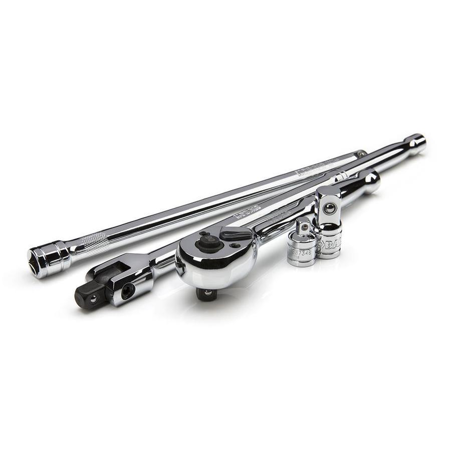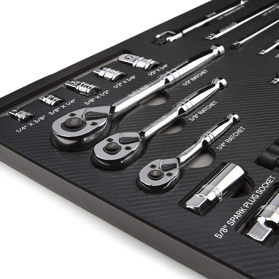Ratchets and sockets include 1/4-in, 3/8-in and 1/2-in drive sizes