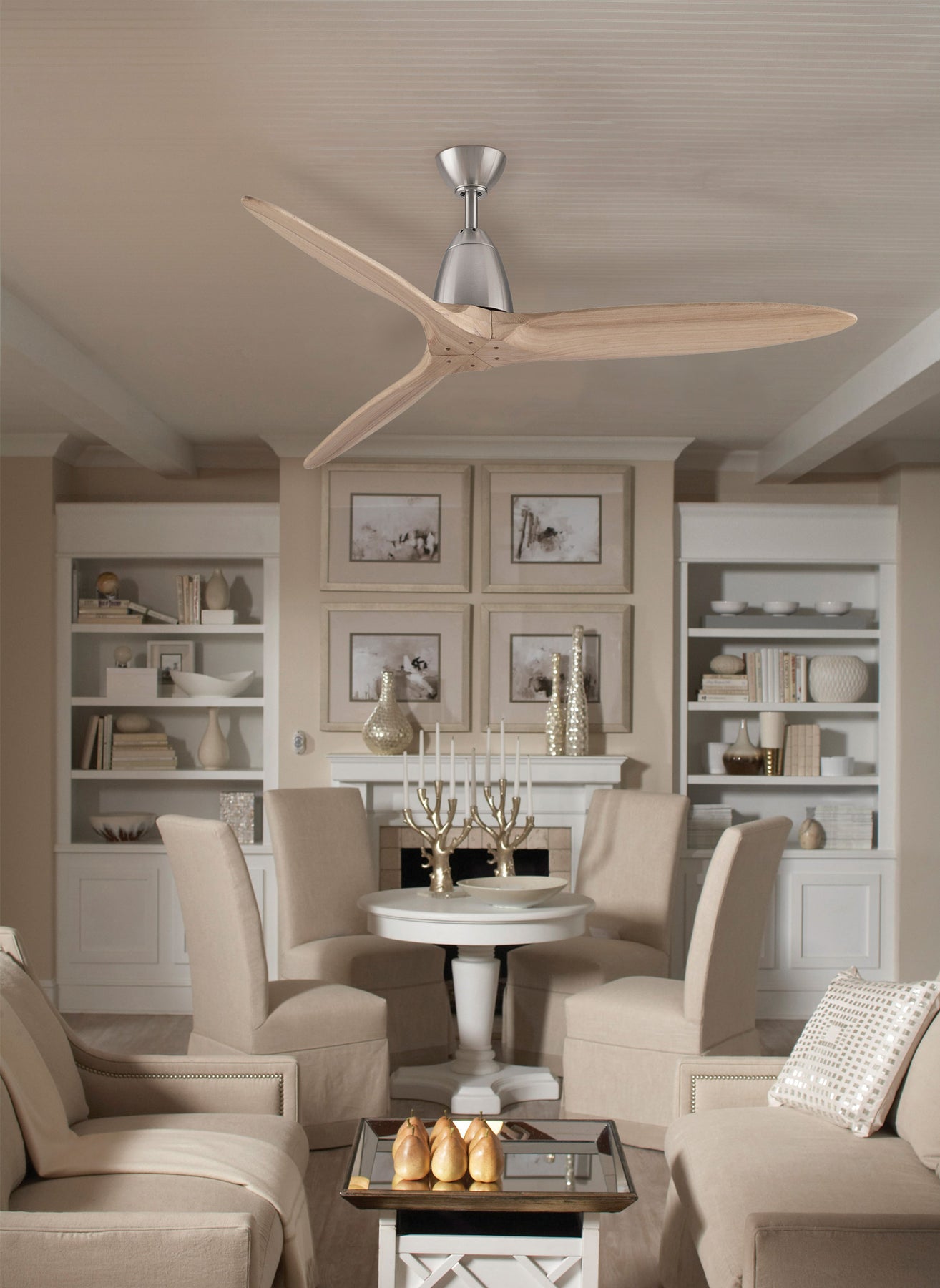 The Prop ceiling fan delivers modern sculptural style with three hand-carved blades and a 60-inch span for ample air movement in larger rooms. Finished in matte greige, it includes a remote with reverse for convenient control and is compatible with an optional wall control.