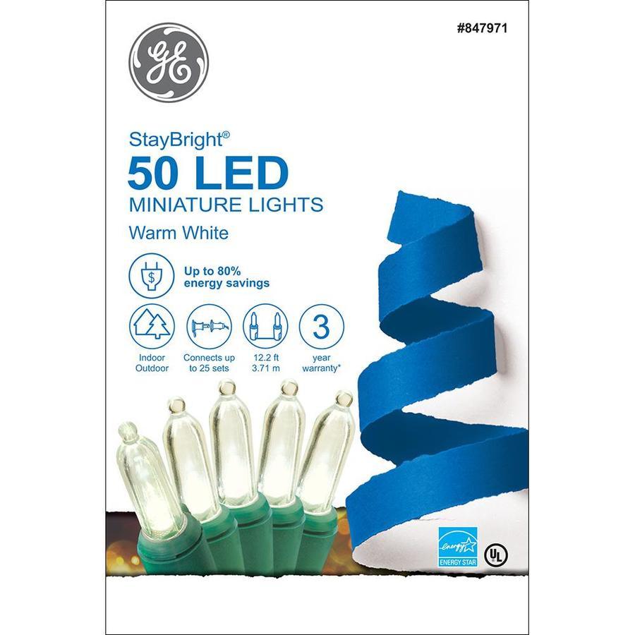 50-Count GE StayBright LED warm white 5.5-MM Christmas string lights Green cord with 12.2-ft lighted length matches your Christmas decor and illuminates your home's interior or exterior Can connect with up to 25 sets to make decorating your home a breeze Replacement bulbs and fuses included for added convenience ENERGY STAR qualified products help you save money on utility bills without sacrificing performance, style or comfort UL safety listing demonstrates this product has met minimum requirements of widely accepted product safety standards 3-Year limited warranty gives you peace of mind Perfect for Christmas trees, ceilings and roof lines Available only at ARB265W